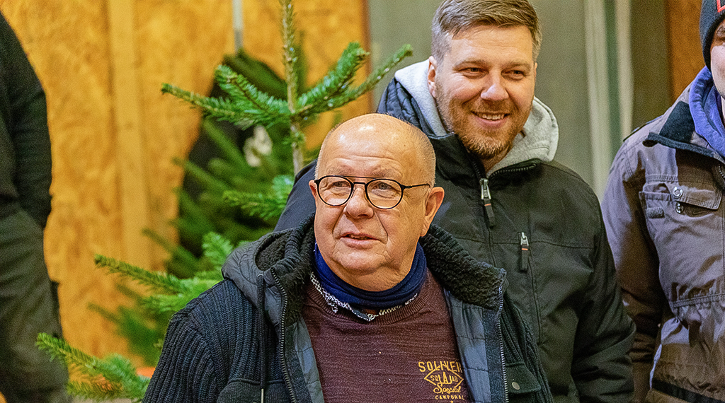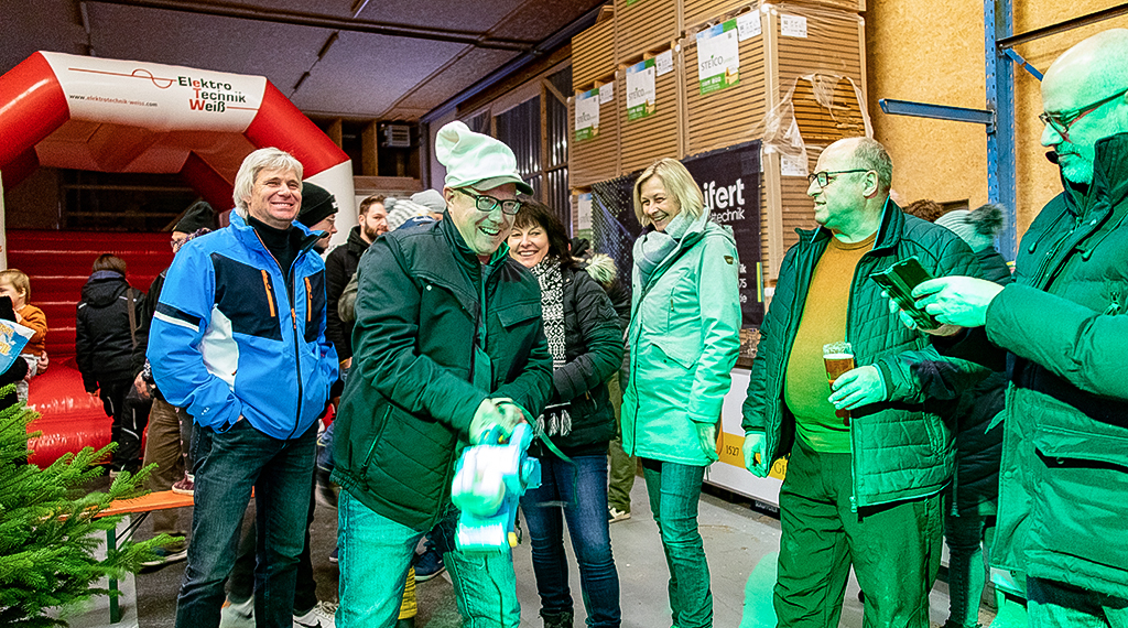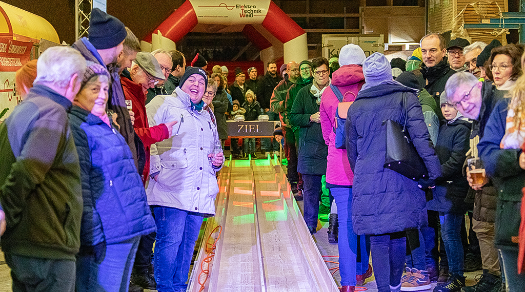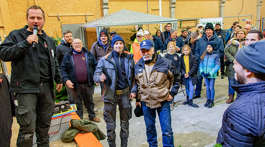 Andreas Greb aus Angersbach moderierte das Rennen, als hätte er zuvor nichts anderes gemacht. Er ist Mitarbeiter in der Zimmerei. Die Idee zu diesem Rennen sei Anfang des Jahres im April/Mai entstanden, erzählt er uns gegenüber. Die Mitarbeiter hätten ein Video bekommen, was sie sehr witzig fanden. „Irgendwann mal setzen wir so einen Bandschleifer auf eine Bahn“, sagt Andreas Greb. Bei einem Richtfest sei die Idee mit dem Bandschleifer wieder in Erinnerung gekommen. „Wir machen ein Bandschleiferrennen zum Spaß“, sagt Greb. Es seien Leute vom Kirmes-Club und Carneval Club Zeppe dabei gewesen. Beim nächsten Richtfest nahm man sich eine Bohle und schraubten OSB-Platten an selbige. Man testete, wie sich ein Bandschleifer fortbewegen könnte. Von der kleinen Gruppe brachte jeder seine Bastelideen ein. So wurde aus diesem Gedanken das erste Rennen. Bis nächstes Jahr im Sommer wollte man nicht warten. So entschied man sich für den Winter auf den Weihnachtsmarkt.