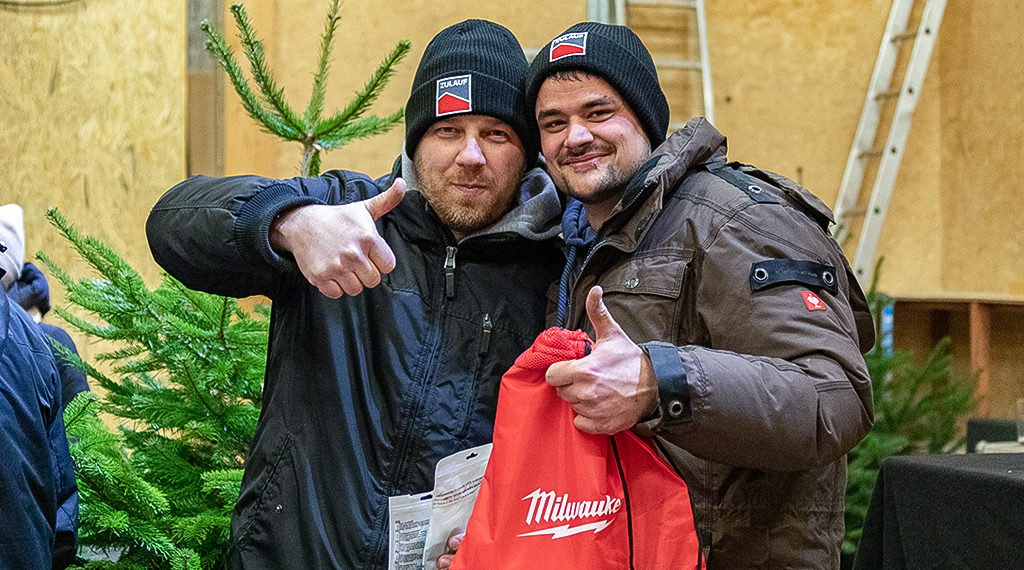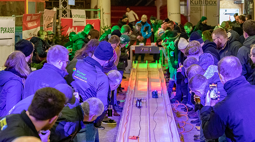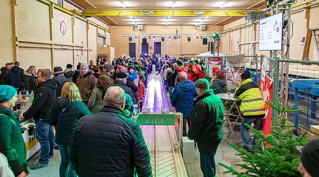 In der vergangenen Woche wurde mit Hilfe vieler freiwilligen Helfern die Werkshalle geputzt, Tannenbäume aufgestellt, alle Vorbereitungen für das Rennen getroffen und gleichzeitig einen Weihnachtsmarkt aufgestellt. Videos gingen in der Firma herum und die Techniker waren gefragt. „Wir dachten, es würden sich nur eine Handvoll Menschen dafür begeistern, aber weit gefehlt. Am Schluss waren 15 Gruppen bereit, allerdings ging einiges kaputt, sodass 12 Gruppen antreten konnten“, erzählt uns Andreas Greb. Beim Aufbau der Elektronik bekamen die Zimmerer tatkräftige Unterstützung von Stefan Carle von der Firma G&N Gefahrenmelde- und Nachrichtentechnik GmbH aus Angersbach. Firmeninhaber Jens Zulauf stellte dem Orga-Team alles kostenlos zur Verfügung. Auf- und Abbauen lässt sich die Rennstrecke mühelos. Dafür wird die Bahn in vier Teile (stapelbar) zerlegt.