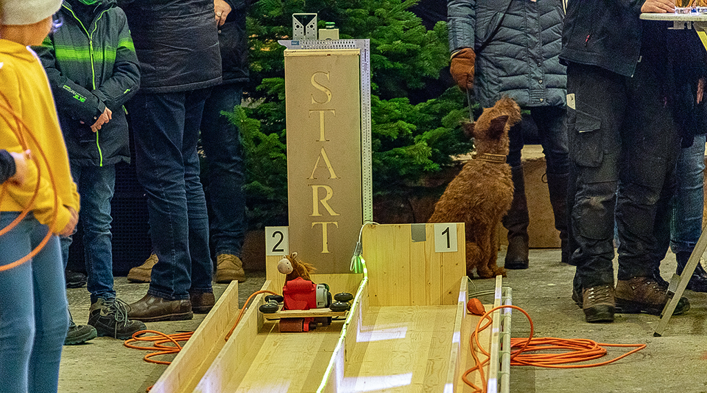 Am Start befand sich der Startknopf, der auf beiden Steckdosen beim Start Strom schaltete. So war sichergestellt, dass beide Bandschleifer zur gleichen Zeit Energie bekamen. Nach 20 Meter hatte man den Zieleinlauf aufgebaut. Mit zwei Lichtschranken wurde festgestellt, welcher Bandschleifer das Ziel zuerst erreicht. Angezeigt wurde dies durch zwei Lampen, wobei nur die Lampe aufleuchtete, dessen Bandschleifer eine der beiden Lichtschranken zuerst passierte. Danach folgte eine Auslaufzone von 3,20 Meter. Gewertet wird das Rennen nach dem Ko-System, Gewinner gegen Gewinner und Verlierer gegen Verlierer. Das Startgeld wurde in Form von Wert-Chips ausgegeben, zusätzlich hatte man Sponsoren mit Sachpreisen ergattert. Platz 1 bekam 30 Wert-Chips, Platz 2 bekam 20 Wert-Chips und Platz 3 noch 10 Wert-Chips. Die anderen Teams bekamen kleine Sachpreise. „Es soll keiner leer ausgehen“, so Andreas Greb. Am Sonntag wurde eine Tombola veranstaltet und weitere Sachpreise verlost. Die Lose verteilte der Nikolaus.