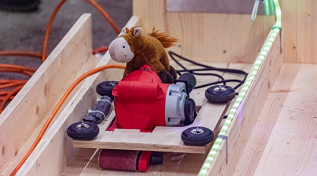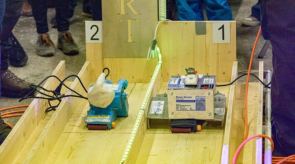Was macht man mit einem Bandschleifer? In Kombination mit dem Schleifrahmen lassen sich Flächen, z. B. Arbeitsplatten, Tischplatten, Türen etc. sehr gut bearbeiten. Glauben Sie, das war es schon? Man kann damit auch ein Rennen bestreiten. Das glauben Sie nicht? Oh doch, es geht! Am Samstagabend fand in Wartenberg-Angersbach das 1. Vogelsberger Bandschleiferrennen statt. Klingt verrückt? Ist es auch, aber es war spannend und hat viel Spaß gemacht. 12 Teams hatten sich mit einem Startgeld von 5 Euro je Bandschleifer auf dem Gelände der Zimmerei Zulauf in Angersbach angemeldet. Die Streckendaten: Bahnlänge gesamt: 24,00 m davon 0,80 m Startzone, 20,00 m Rennstrecke und 3,20 m Bremszone. Bahnbreite: 0,32 m mit je einer 0,10 m breiten Stromtrasse und einer Bandenhöhe von 0,10 m. Der Schleifer: Zugelassen waren alle handelsüblichen Bandschleifer mit einem 230-Volt-Anschluss. Die Korngrößen des Schleifpapieres konnten frei gewählt werden. Eine seitliche Führung passend zur Bahnbreite wurde empfohlen.