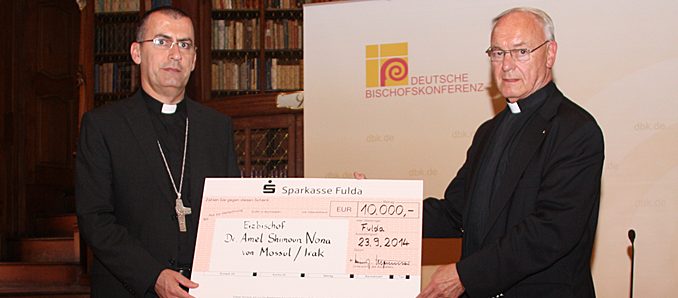 Fulda. Das Bistum Fulda möchte den von der Terrorgruppe „Islamischer Staat“ vertriebenen Menschen helfen und hat daher 10.000 Euro für Medikamente, Winterkleidung besonders für Kinder und Babynahrung bereitgestellt. Das Geld wird in den nächsten Tagen an die katholische Kirche im Nordirak überwiesen. Bischof Heinz Josef Algermissen überreichte dem chaldäischen Erzbischof von Mossul, Dr. Amel Shimoun Nona, am Dienstag einen symbolischen Scheck über 10.000 Euro. Der irakische Bischof, der zusammen mit allen Christen durch die Terroristen aus seiner Stadt vertrieben wurde und nun mit ihnen in Erbil (Kurdistan) lebt, ist derzeit Ehrengast der Deutschen Bischofskonferenz auf ihrer Herbstvollversammlung in der Bonifatiusstadt. Shimoun Nona hatte den deutschen Bischöfen die katastrophale Lage der Flüchtlinge im Nordirak geschildert.