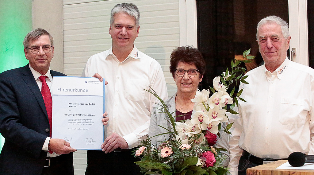 Paltian Treppenbau aus der bayerischen Rhön blickt auf eine 100-jährige und sehr erfolgreiche Firmengeschichte zurück. Bereits in der vierten Generation führt der heutige Inhaber und Geschäftsführer, Michael Paltian, mit aktuell 60 Mitarbeitenden – darunter acht Auszubildende - das Familienunternehmen. Aufgrund der Corona-Pandemie musste die offizielle Feier zum runden Geburtstag zum Jahresende des letzten Jahres (22.12.2022) nachgeholt werden und konnte zusammen mit der Weihnachtsfeier am letzten Produktionstag gebührend gefeiert werden.