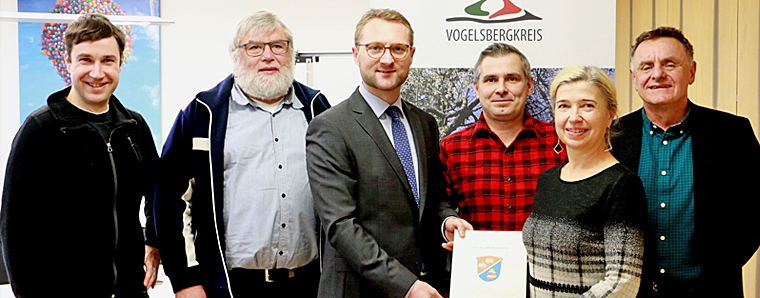 LEADER-Mittel für barrierefreie öffentliche Toiletten am Hoherodskopf – Wirtschaftsdezernent Dr. Jens Mischak überreicht Schottens Bürgermeisterin Susanne Schaab den Zuwendungsbescheid. Das Foto zeigt außerdem von links Matthias Sebald (Mitarbeiter der Kreisverwaltung), Werner Weitzel (Ortsbeirat Breungeshain), Andreas Däsch (Inhaber der Hoherodskopfklause) und Thomas Schaumberg (Vogelsberg Consult GmbH). Foto: Gaby Richter