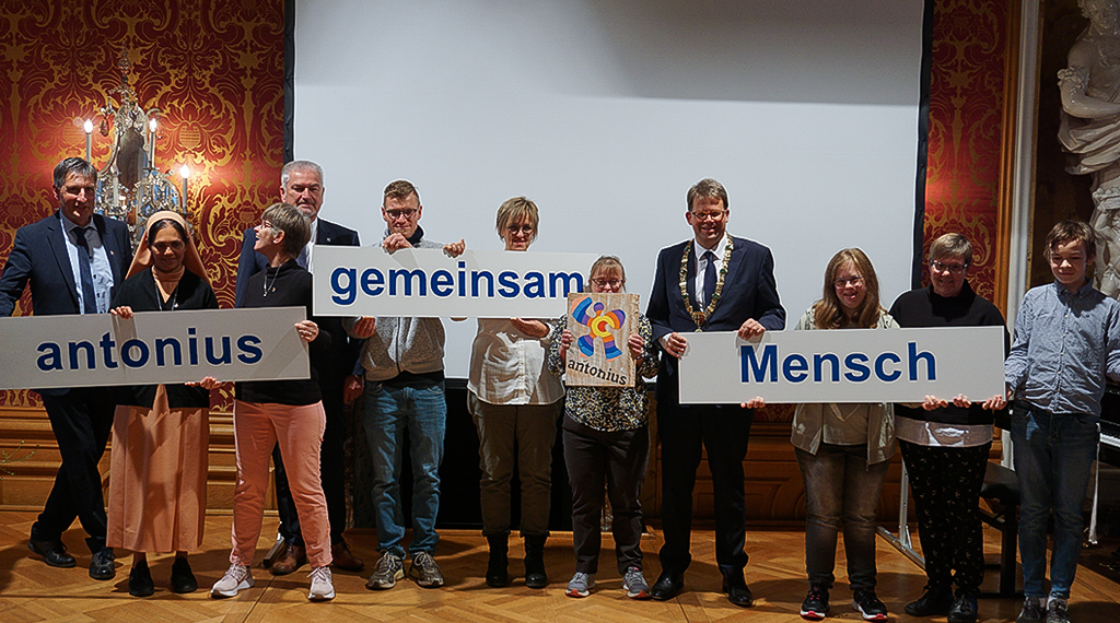 Aktuell leben bei antonius : gemeinsam Mensch etwa 320 Menschen in verschiedenen Wohnformen auf dem Hauptgelände An St. Kathrin in Fulda, in unterschiedlichen Liegenschaften im Stadtgebiet sowie im Landkreis Fulda. Das Netzwerk bietet insgesamt rund 1.250 Arbeits- und 80 Ausbildungsplätze für Menschen mit und ohne Behinderung und ist damit einer der größten Arbeitsgeber der Region. Mehr als 290 Ehrenamtliche, etwa 70 junge Menschen im Freiwilligendienst und 250 Praktikanten engagieren sich bei antonius. Das von bürgerlichem Engagement getragene Netzwerk ist wirtschaftlich und politisch unabhängig sowie konfessionell und parteipolitisch ungebunden. Der Oberbürgermeister der Stadt Fulda, Dr. Heiko Wingenfeld, erinnerte in seiner Rede anlässlich des Empfangs an die frühe Gründungsgeschichte der heutigen Bürgerstiftung und an die Bürgerin, die nicht nur als Initiatorin des späteren „Antoniusheims“ fungierte, sondern auch Fulda stark prägte: Maria Rang, deren Porträt um 1910 im Fürstensaal des Stadtschlosses unter den letzten 14 Fürstäbten und Fürstbischöfe bis 1802 noch heute an ihr einfühlsames und soziales Wirken erinnert.