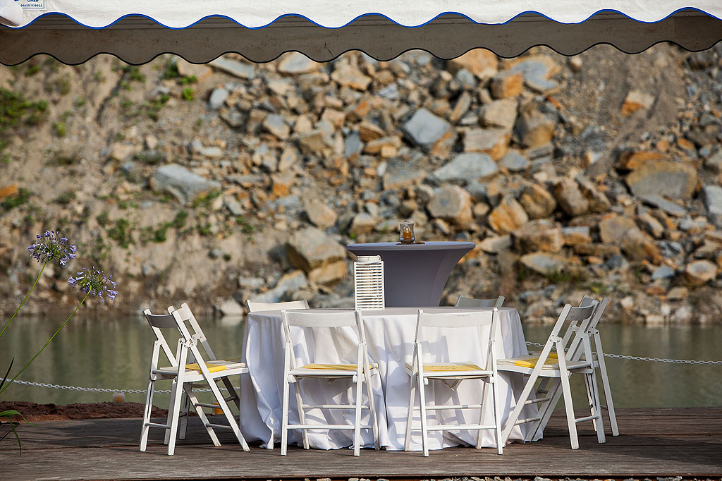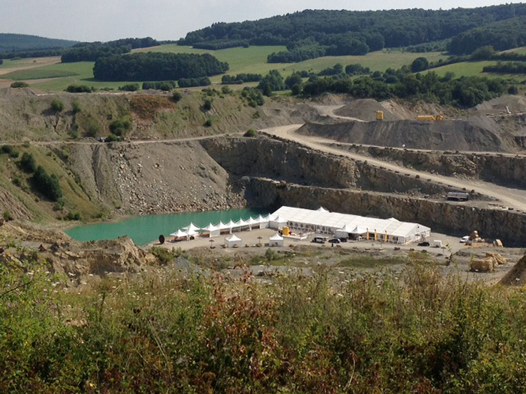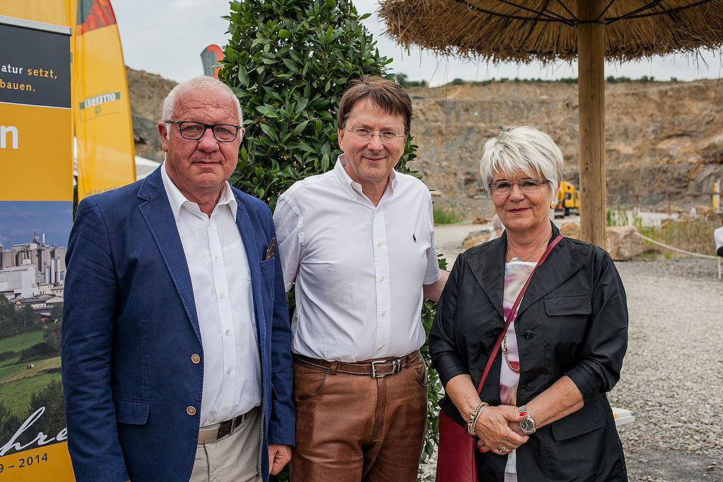 Großenlüder/Müs. „Ein Kalkwerk entsteht“, so lautet die Überschrift des ersten Kapitels in der großen Unternehmenschronik der Zement- und Kalkwerke Otterbein, die jetzt druckfrisch anlässlich des 125-jährigen Jubiläums an Mitarbeiter, Kooperationspartner, Kunden und Freunde verteilt wurde. In dem knapp 100-seitigen Werk wird mit vielen historischen und aktuellen Bildern die wechselvolle Unternehmensgeschichte aufgezeigt. Vor imposanter Kulisse im Steinbruch hatte jetzt die Unternehmerfamilie zum Firmenjubiläum und zum 60. Geburtstag des geschäftsführenden Gesellschafters Winfried Müller geladen. Anlässlich der Feierlichkeiten waren drei Generationen der Familie vertreten: Seniorchefin Rosa Müller, Winfried Müller mit Ehefrau Maria-Theresia sowie die Kinder Marie-Luise, Katharina und Dr. Christian W. Müller, der seit 2013 bei Otterbein im Bereich Unternehmensentwicklung aktiv ist.