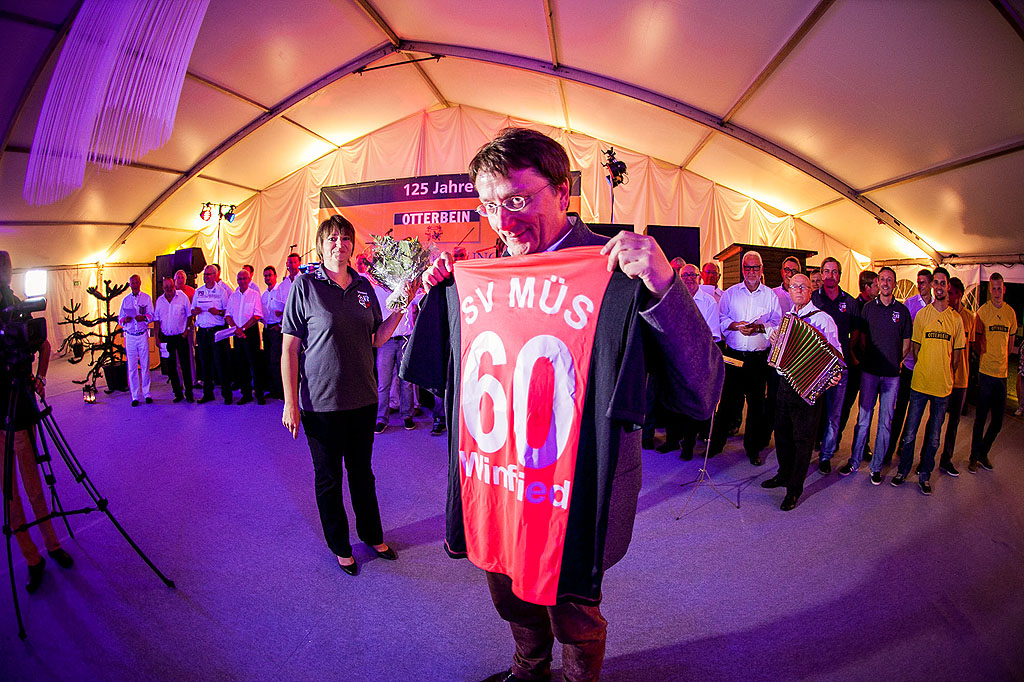 Geschäftsführer Winfried Müller ließ vor rund 400 Gästen die wechselvolle Firmengeschichte Revue passieren: 1889, Deutschland war noch ein Kaiserreich, schloss Georg Otterbein mehrere kleine Kalkbrennereien der Umgebung zu den „Kalkwerken Otterbein“ zusammen – der Beginn einer ereignisreichen Entwicklung. In seiner Begrüßung verdeutlichte Winfried Müller, dass 2014 ein besonderes Jahr für das Unternehmen Otterbein sei: Neben dem Firmenjubiläum und seinem 60. Geburtstag begeht seine Mutter Rosa Müller ihr 75. Dienstjubiläum, sein Vater Josef Müller wäre in diesem Jahr 100 Jahre und sein Großvater August Otterbein 125 Jahre alt geworden. Dankesworte richtete Müller insbesondere an seine Familie für die stetige Unterstützung sowie an seine derzeitigen und ehemaligen Mitarbeiter, Kunden, Lieferanten und die Mitglieder des Unternehmensbeirats. Daneben dankte er dem „Geschichtsbüro Köln“ für die Konzeption der Chronik, Asmoron Teckie und seinem Team für die perfekte Organisation der Veranstaltung sowie dem SV Germania Müs und der Freiwilligen Feuerwehr Müs für ihr Engagement. Zudem unterstrich der Unternehmer seine tiefe Verbundenheit zur Gemeinde Müs. Daher hatte er im Vorfeld anstelle von Geschenken um Spenden zugunsten der kirchlichen und sozialen Einrichtungen des Ortes gebeten. Für die Zukunft wünschte sich Winfried Müller „mehr Zeit für die Familie und die Hobbies.“ Gleichzeitig richtete der 60-Jährige den Blick in die Zukunft: „Ich wünsche mir, dass es uns gelingen wird, die Rohstoffbasis weiter auszubauen und unser Unternehmen durch den Ausbau von strategisch-perspektivischen Wachstumsfeldern weiter voranzubringen.“