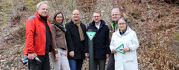 Den Auftrag dafür hat Thomas Gärtner von der Firma PBV Schotten erhalten. „Er hat schon für verschiedene Kommunen, Vereine, den Geopark und den Naturpark Vulkanregion Vogelsberg Schilder aufgestellt und verfügt über sehr viel Erfahrung und Ortskenntnisse“, begründet Susanne Jost von der Unteren Naturschutzbehörde. Sie hat Herrn Gärtner mit Lageplänen, Koordinaten und den genauen Standortwünschen für die Beschilderung ausgestattet. Von den Forstämtern hat er die entsprechenden Erlaubnisse, so dass es jetzt losgehen kann, sobald der Boden nicht mehr hart gefroren ist. An der "Muschelkalkkante am Sonnberg" in Angersbach – eines der 45 Geotope im Kreis – wurde das neue Schild schon aufgestellt: Umweltdezernent Dr. Jens Mischak, Bürgermeister Dr. Olaf Dahlmann, Hartmut Greb vom Geopark Vulkanregion Vogelsberg sowie Gudrun Huber-Kreuzer und Susanne Jost von der Unteren Naturschutzbehörde haben sich den "Prototypen" angeschaut.