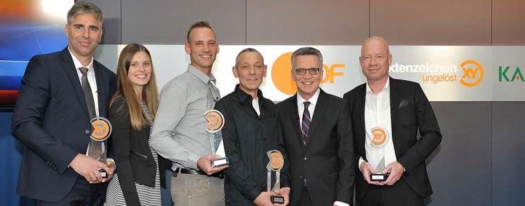 Berlin. Im ZDF-Hauptstadtstudio Berlin hat Bundesinnenminister Dr. Thomas de Maizière als Schirmherr den "XY-Preis - Gemeinsam gegen das Verbrechen" für mutiges und vorbildliches Handeln verliehen. Der mit jeweils 10 000 Euro dotierte Preis ging in diesem Jahr an Carsten Röder, Frank Wolfgang Schmidt und Raphael Soler-Lopez sowie Stefan Tommek für ihren beispielhaften Einsatz gegen Kriminalität.