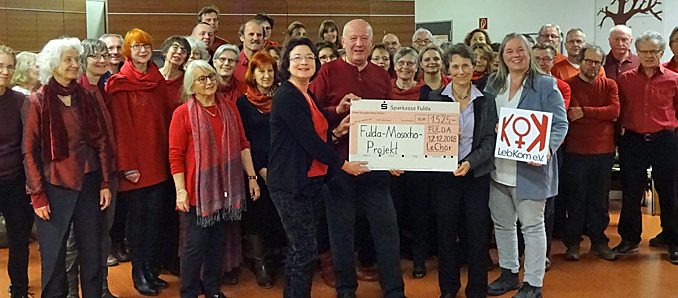 Diese Summe hatten Zuhörer während eines gemeinsamen Benefizkonzertes von Le Chör mit dem gemischten Projektchor des Männergesangvereins Wiesen-Traisbach in der Hofbieberer Kirche St. Georg zugunsten des Fulda-Mosocho-Projektes gespendet. Es sei sehr bewegend gewesen, mit ihren Liedern nicht nur die Menschen zu erfreuen, sondern auch einen Beitrag leisten zu können, die Menschenrechtsverletzung der weiblichen Genitalverstümmelung zu überwinden, so Jorden. Die engagierte Berufsmusikerin plant dazu bereits den nächsten ehrenamtlichen Einsatz: die musikalische Umrahmung einer Lesung über das Fulda-Mosocho-Projekt mit ihrer A-cappella-Gruppe „Die Loreleyas“ in der Biebertalschule in Hofbieber im Februar.