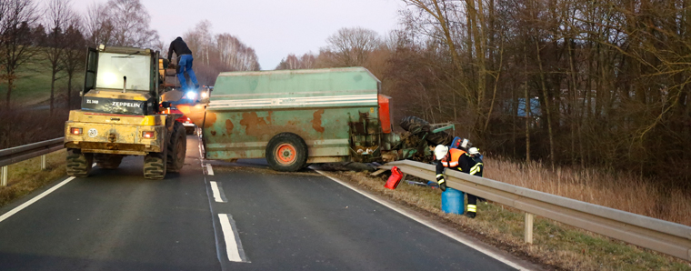 Am späten Donnerstagabend ist auf der B40 bei Flieden im Kreis Fulda ein 17-jähriger mit einem Traktorgespann schwer verunglückt. Im Anhänger des Gespanns transportierte der Jugendliche mehrere Tonnen Futtermittel, als sich der Anhänger auf der geraden Strecke plötzlich aufschaukelte und für den jungen Mann unhaltbar wurde. Das Gespann prallte erst nach rechts in die Leitplanke und schleuderte danach über die ganze Fahrbahn in die linke Leitplanke. Die Zugmaschine walzte dabei die Schutzplanke nieder und stürzte dahinter auf die Seite. Der 17-Jährige hatte unglaubliches Glück und wurde nur leicht verletzt. Er ließ sich zwar vor Ort vom Rettungsdienst behandeln, verweigerte aber den Weitertransport in ein Krankenhaus. Da sich der umgestürzte Traktor und der Anhänger ineinander und mit der Leitplanke verkeilt hatten und erst aufwendig voneinander getrennt werden mussten, dauerte die Bergung bis in den späten Abend. Die Bundesstraße musste voll gesperrt werden. Die Polizei schätzt den Schaden auf 80.000 Euro. +++