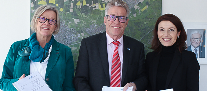 Winfried Ottmann bei der Übergabe der Förderbescheide in Höhe von insgesamt 1,7 Millionen Euro zusammen mit Bürgermeisterin Monika Böttcher (rechts) und Sigrid Nölke, Fachbereichsleiterin der Kinderbetreuung in Maintal