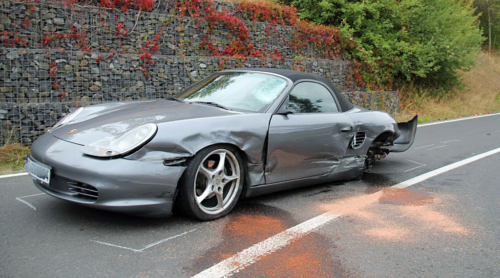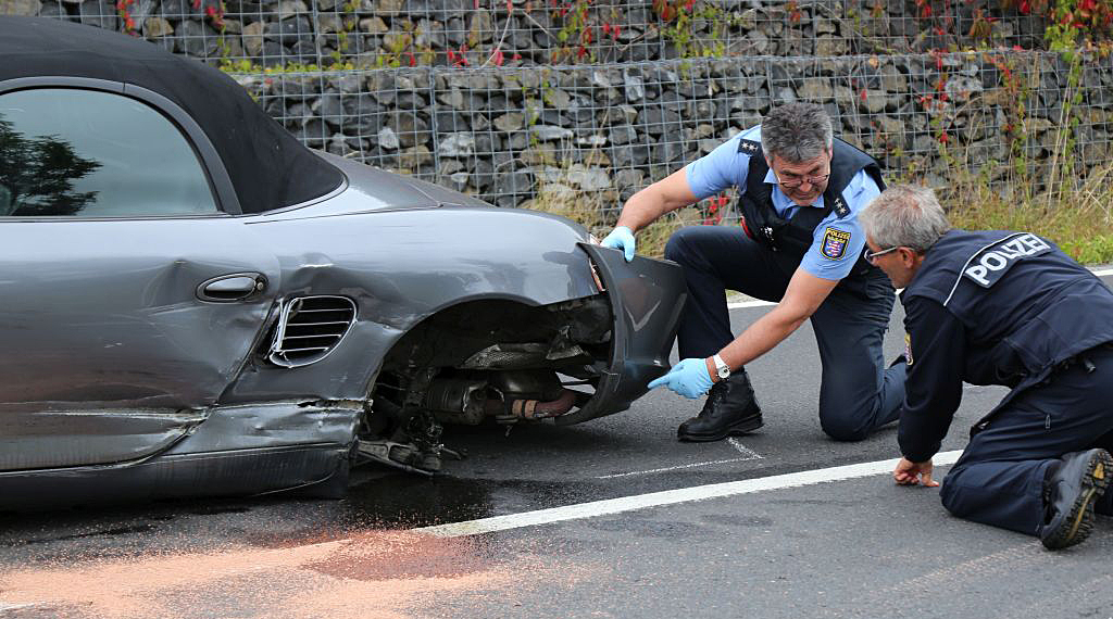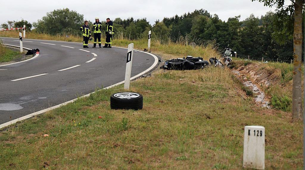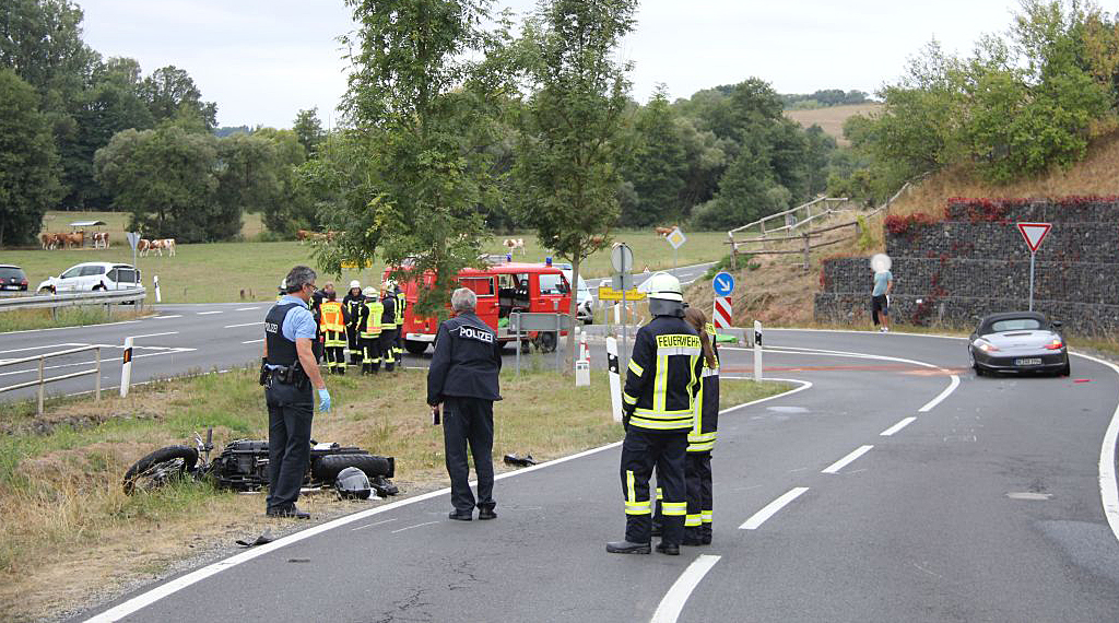 Am Sonntagnachmittag kam es bei Morles im Landkreis Fulda zu einem folgenschweren Verkehrsunfall, bei dem vier Personen zum Teil lebensgefährlich verletzt wurden. Der 20-jährige Fahrer eines Porsche Boxster aus Wiesbaden war mit dem Sportwagen Kreisstraße von Hofaschenbach kommend in Richtung der Einmündung Landstraße unterwegs, um nach Hünfeld weiterzufahren. Wenige Meter vor der Einmündung zur Landesstraße kommt eine Rechtskurve. Ausgangs dieser Kurve geriet der Wiesbadener aus bislang unbekannter Ursache über die Fahrbahnmitte hinaus und prallte seitlich mit der Fahrerseite gegen die Yamaha, die von einem 57-jährigen Mann aus dem Vogelsbergkreis gefahren wurde, der gerade aus Richtung Hünfeld kommend, eingefahren war und dem Porsche begegnete. Das Krad wurde nach rechts von der Fahrbahn geschleudert und landete samt Fahrer im angrenzenden Flutgraben. Nach dieser Kollision brach das Heck des Porsches nach links aus und erfasste nunmehr die nachfolgende Harley Davidson, die von einem 52-jährigen Mann gesteuert wurde, der auch aus dem Vogelsbergkreis stammt. Die Harley Davidson prallte gegen das linke Hinterrad des Sportwagens, wurde von diesem ebenfalls nach rechts von der Fahrbahn geschleudert und landete samt Fahrer an der rechten Bankette. Durch den Anprall wurde das linke Hinterrad des Porsches von der Achse gerissen. Auf drei Rädern rollte der Pkw noch ca. 20 Meter weiter und kam unmittelbar vor der Einmündung zur Landessstraße zum Stillstand. Beide Motorradfahrer erlitten schwere Verletzungen und wurden von den alarmierten Rettungswagen in umliegende Krankenhäuser eingeliefert. Der ebenfalls im Einsatz befindliche Rettungshubschrauber wurde nicht benötigt. Auch der Wiesbadner und seine 20-jährige Beifahrerin aus der Gemeinde Burghaun wurden vorsorglich mit Rettungswagen in das Krankenhaus verbracht. Der Gesamtschaden wird auf ca. 30.000 Euro geschätzt. Neben fünf Rettungswagen waren der leitende Notarzt, drei Notärzte sowie die Besatzung des Rettungshubschraubers im Einsatz. Kräfte der Freiwilligen Feuerwehr der Gemeinde Nüsttal unter Führung von GBI Stefan Hohmann unterstützten die Absperrmaßnahmen und reinigten die Fahrbahn. Für die Dauer der Unfallaufnahme war die Kreisstraße bis gegen 18:00 komplett gesperrt. +++ sw/hs/nh - Update 20.00 Uhr