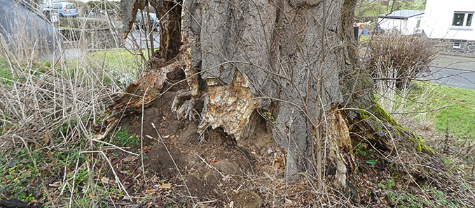 Wobei: Die Siechlinde krankte schon seit Jahren. Bereits 1983 wurde Pilzbefall im Stammfußbereich festgestellt. Im Jahr 2000 sollte der Baum sogar schon gefällt werden. Seit den 50er Jahren sind um die mächtige Linde, die damals in einem parkähnlichen Umfeld stand, Wohnhäuser entstanden. Da das Grundstück des Naturdenkmals nun ebenfalls bebaut werden soll, wurde für den Reststamm in Abstimmung mit der Gemeinde ein neuer Ablagerungsort in der Gemarkung Burg-Gemünden gefunden.
