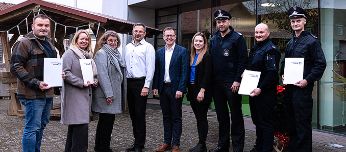 Freude über Zuschüsse (von links): Robin Bernhauer (Betriebsleiter Ulsterwelle), Alexandra Spiegel (Leitung Kita Eckweisbach), Silvia Reinhardt (Kuratorin Kita Eckweisbach), Bürgermeister Ronny Günkel, Erster Kreisbeigeordneter Frederik Schmitt, Lea Limpert (Sachbearbeiterin Feuerwehr Hilders), Klaus-Peter Schafsteck (Gemeindebrandinspektor 01 Hilders), Maximilian Wagner (Feuerwehr Eckweisbach/Liebhards/Unterbernhards) und Michael Dietrich (Feuerwehr Hilders). Foto: Sebastian Mannert
