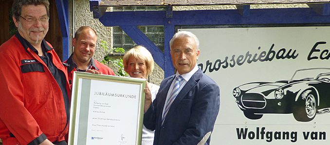 Dipperz. Anlässlich einer Feierstunde zum 25 jährigen Bestehen überreichte Geschäftsführer Manfred Schüler, Kreishandwerkerschaft Fulda, die Jubiläumsurkunde der Handwerkskammer Kassel. Schüler überbrachte auch die Glückwünsche von Obermeister Claus Uth und der Kollegen aus der Karosserie- und Fahrzeugbauerinnung Osthessen. In seiner Begrüßung ging der Unternehmensgründer Wolfgang van Deyk auf den Werdegang und die 25jährige Geschichte des anerkannten Karosseriefachbetriebes ein. Das Jahr 1984 spiel-te eine ganz wichtige Rolle, denn Wolfgang van Deyk machte mit der ehemaligen Eckartsmühle, etwas außerhalb von Dipperz gelegen, Bekanntschaft.