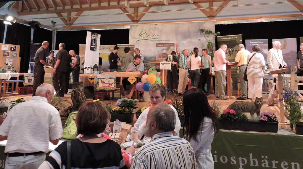 Zum runden Geburtstag wollte die Hessische Verwaltungsstelle in Gersfeld etwas Besonderes bieten und fand in Bürgermeister Steffen Korell einen tatkräftigen Partner. Kurzerhand wurde der traditionelle Gersfelder Bauernmarkt, auf dem sich Rhöner Direktvermarkter präsentieren, um einen Erlebnismarkt Milch & Honig erweitert, bei dem es um die Bedeutung und Leistungsfähigkeit der heimischen Landwirtschaft geht. Diese Freiluft-Märkte auf dem Marktplatz und im Schlosspark wurden ergänzt durch einen inhaltsreichen Biosphären-Markt in der Stadthalle. Diese Ausstellung machte das enorme Spektrum der inhaltlichen Arbeit des Biosphärenreservats und seiner vielen Partner deutlich. Die Mischung aus Erleben, Lernen und Genießen kam besonders gut an. Bis in den späten Nachmittag herrschte in der Gersfelder Innenstadt reges Treiben und im weiten Umfeld war kaum noch ein Parkplatz zu bekommen.