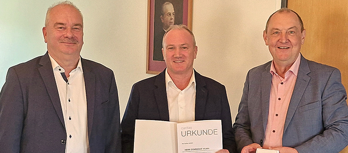 Im Jahr 2012 übernahm Dominique Vilmin die Ressortleitung im Bereich der heutigen Eingliederungshilfe und Teilhabe. Wegen einer Vakanz leitete er ab 2017 zusätzlich kommissarisch das Ressort Jugendhilfe. 2020 schließlich wechselte Vilmin dann auf Bitten des Verbandsvorstands endgültig in den Bereich Jugendhilfe, wo er noch heute leitend tätig ist. „Für den Wechsel zur Jugendhilfe waren wir Dir sehr dankbar“, erinnerte sich in seiner Ansprache Ansgar Erb, Mitglied des Vorstands, der die Laudatio Juchs fortführte. „Die Jugendhilfe ist ein wesentliches, aber besonders sensibles Arbeitsfeld unserer Caritas, und es war gut, dass Du mit Deiner Expertise dort zum Einsatz kamst.“ Aber sowohl zuvor im Bereich der Behindertenhilfe wie auch anschließend bei der Jugendhilfe, so betonten Juch und Erb einhellig, sei in all den Jahren die Zusammenarbeit mit dem Jubilar Vilmin vertrauensvoll, fachlich fundiert und erfolgreich gewesen. „Dafür sprechen wir Dir unseren herzlichen Dank aus“, so die beiden Caritas-Spitzenvertreter abschließend.