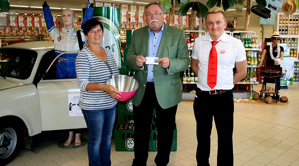 Schlitz/Queck. Seit Mittwoch ist es klar, 29 Bierkisten kann man in den Trappi-go-601 einladen und ihn auch noch fahren. Von mehr als 300 TeilnehmerInnen hatten immerhin 10 mit 29 die richtige Zahl in die Karte des Gewinnspieles des REWE-Getränkemarktes eingetragen. Es war kurz vor der diesjährigen Rally angeboten worden. Damit war klar, dass das Glück entscheiden und die Gewinnerkarte aus der Lostrommel gezogen werden musste. Kein Geringerer als unser Stadtoberhaupt Hans-Jürgen Schäfer erklärte sich am Mittwochnachmittag erfreulicherweise gerne bereit, den Glücksbringer zu spielen, wobei er die Karte von Reiner Schafhaupt aus Queck gezogen hat. Verständlich, dass sich der Gewinner riesig freute, denn bisher hatte er noch nie einen Preis gewonnen. Und die 290 Liter Gerstensaft kommen für ihn und seine Familie zum richtigen Zeitpunkt, denn es stehen in naher Zukunft einige Familienfeiern an, wie er uns gegenüber stolz erwähnte. Selbst, wenn alle 29 Licher Kästen mit 20 halbe Liter Flaschen dann noch nicht ausgetrunken sein sollten, wäre das kein Problem, denn das Haltbarkeitsdatum läuft in diesem Jahr noch nicht ab. Auch der Transport der großen Ladung war für den Gewinner kein Problem, er konnte sie 5 Stunden später allesamt in sein geräumiges Fahrzeug einladen. +++ fuldainfo
