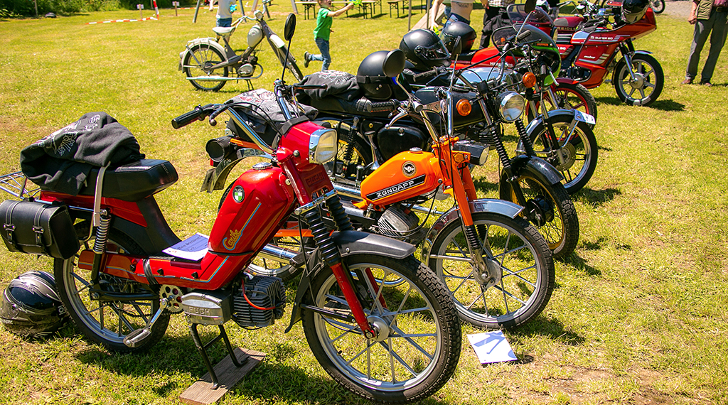 Währenddessen wurden auf dem Grillplatz in Blankenau ab 11.30 Uhr Besitzer von alten Mopeds, Mokicks, Mofas, Motorrädern aus den 50er, 60er, 70er und 80er-Jahre, die Ihre „Retro Feuerstühle“ präsentieren wollten, erwartet. Jeder der wollte, konnte sich kostenfrei mit seinem Gefährt der Ausstellung anschließen, ob restauriert, im Originalzustand und völlig markenoffen, von Ape bis Zündapp, jeder konnte an dieser nostalgischen Zeitreise teilnehmen.