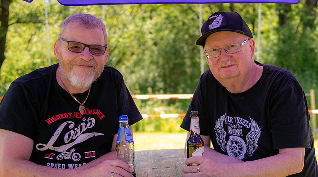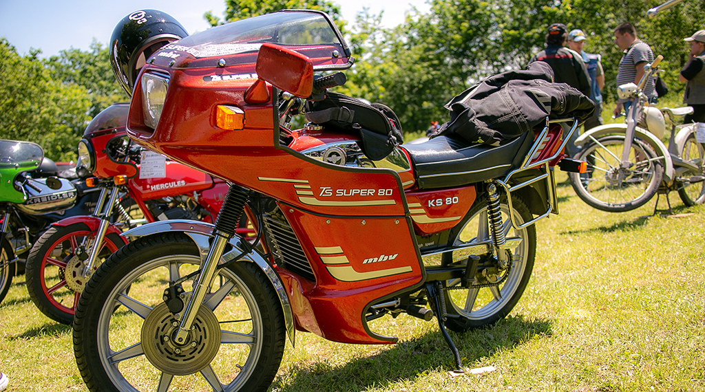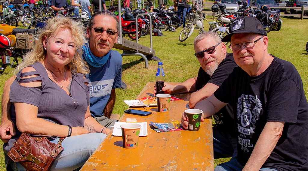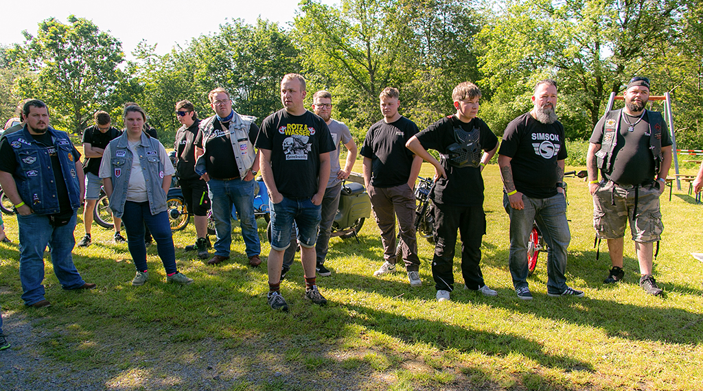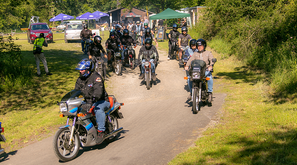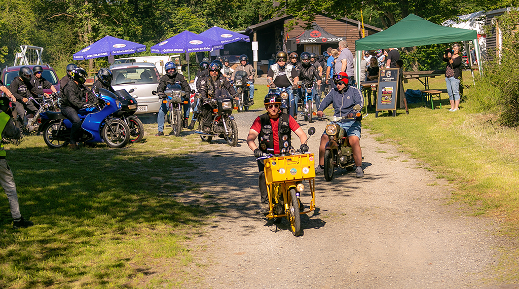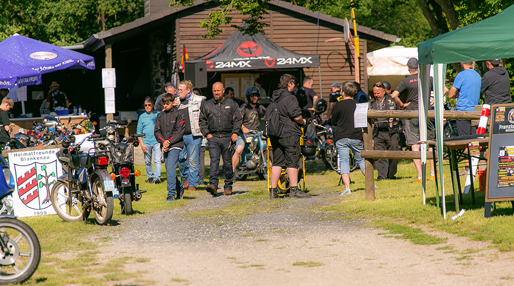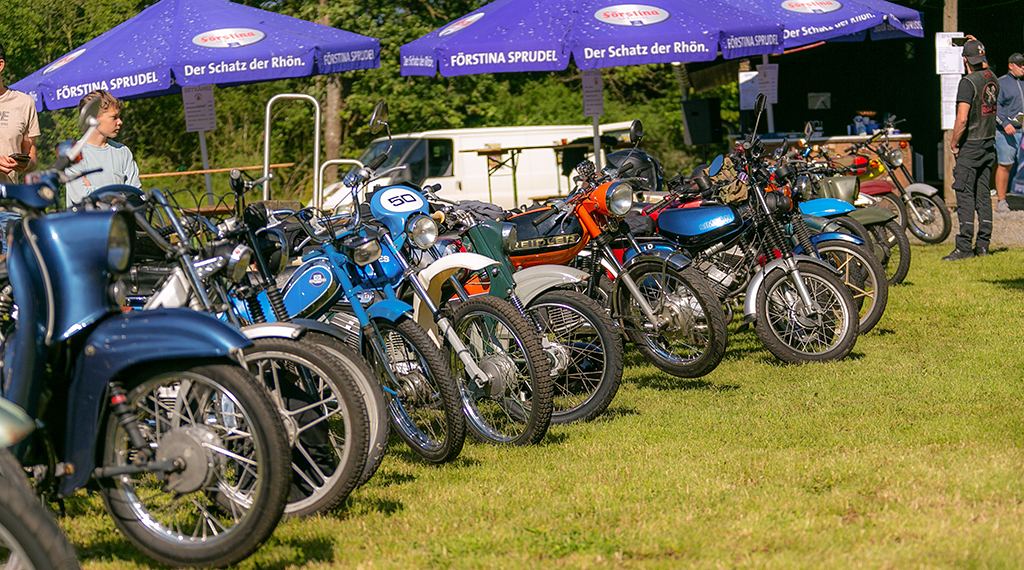 Nach einem guten Frühstück war es dann so weit, die Moped-Fahrerinnen und Fahrer starteten zu einer „Moped 50 ccm-Ausfahrt“ unter dem Titel „Ring of Fire“ durch den Vogelsberg. In einem langen Konvoi von rund 40 Fahrzeugen ging es bei klarem Himmel und Sonnenschein los. Mit einer Durchschnittsgeschwindigkeit von circa 40 Stundenkilometern führte die Route von rund 110 Kilometern durch die wunderschöne Landschaft des Vogelsberg mit bis zu 1.300 Höhenmetern. Nach einer reinen Fahrzeit von zweieinhalb Stunden kamen am frühen Nachmittag gegen 14.30 Uhr alle Mitfahrerinnen und Mitfahrer wieder in Blankenau an. Anders als im vergangenen Jahr gab es dieses Mal keine großen Ausfälle. Das Pannenfahrzeug konnte in Blankenau bleiben. Kleinere Pannen konnten an Ort und Stelle repariert werden.