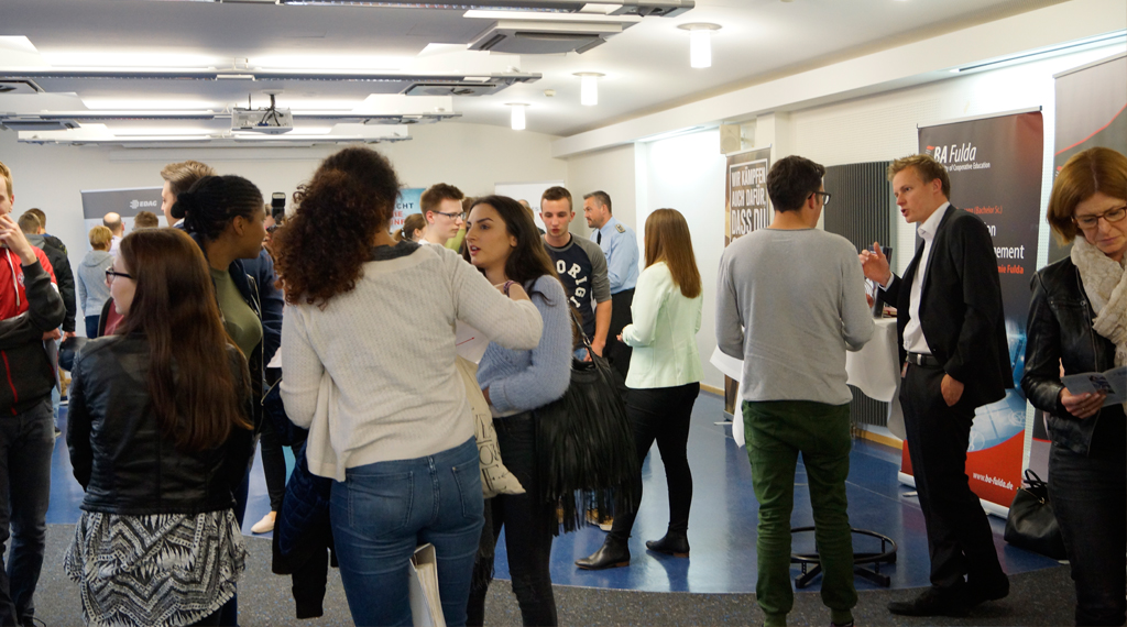 An der BA Fulda gibt es derzeit drei duale Studiengänge – Internationale Betriebswirtschaftslehre und Mittelstandsmanagement sowie Industrie 4.0, der in diesem Jahr zum ersten Mal im Oktober angeboten wird. An der Berufsakademie Fulda wechseln sich während der dreijährigen Studienzeit Studien- und Praxisphasen im zwölfwöchigen Rhythmus ab. Dass sich das Studienangebot der Hochschule Fulda von dem der BA unterscheidet, machte Professor Steven Lambeck deutlich. Derzeit gibt es acht duale Studiengänge an der Hochschule. In einigen sind Berufsausbildungen integriert, andere beinhalten eine berufspraktische Orientierung. Angebote gibt es in den Fachbereichen Gesundheit und Sozialwesen, Elektrotechnik und Informationstechnik sowie Wirtschaftswissenschaften.