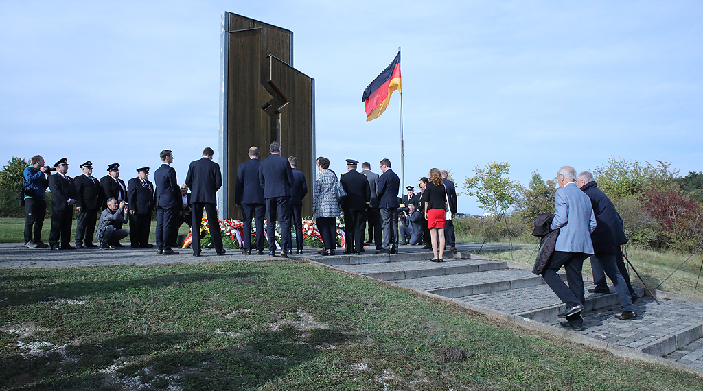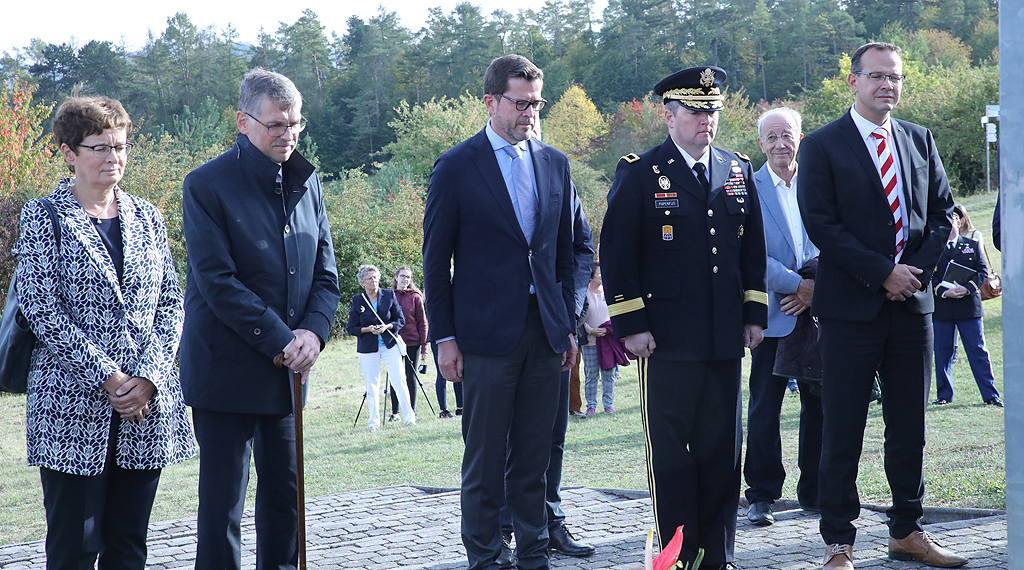 „Der 3. Oktober markiert einen historischen Wendepunkt für Deutschland, Europa und die Welt. Einzeln, aber auch im Zusammenhang betrachtet, ergibt sich ein klares Plädoyer: weg vom Gegeneinander, hin zum Miteinander. 71 Jahre nach dem Inkrafttreten des Grundgesetzes, fast 60 Jahre nach dem Mauerbau, können wir heute auf 30 Jahre Deutsche Einheit mit Dank zurückblicken“, stellte der Stiftungsratsvorsitzende gestern anlässlich des Festaktes zur deutschen Wiedervereinigung heraus. In seinen Ausführungen spannte er einen Bogen von den historischen Ereignissen in der Vergangenheit bis in die Gegenwart. Der 3. Oktober sei nicht nur der „glücklichste und wichtigste gesamtdeutsche Feiertag“, sondern auch ein Freiheitstag, der nie in Vergessenheit geraten dürfe. Eine Erfolgsgeschichte, in der die Freiheit des Einzelnen als unabdingbares Menschenrecht gelte. Wie damals stehe man aber auch heute als Solidaritätsgemeinschaft vor großen Herausforderungen. Der Umgang mit Migration, die Auswirkungen der Corona-Pandemie und die offene Rückwärtsgewandtheit einiger schürten Gräben, die es im Sinne eines geeinten Europas zu überwinden gelte. Historisches Bewusstsein fördere ein gutes politisches Gespür. Es gelte, intelligent mit der Geschichte umzugehen, aus ihr zu lernen und in einem demokratischen Staat und einem demokratischen Europa keinen Platz für Intoleranz zu dulden. Genau dafür biete die Gedenkstätte Point Alpha die optimalen Voraussetzungen. Als Gedenk- und Mahnstätte sowie als Begegnungs- und Lernort, die sich der historischen, politischen Jugend- und Erwachsenenbildung widmet und mit ihren Angeboten einen wichtigen Beitrag dazu leistet. Auf Basis der historischen Ereignisse sei Point Alpha ein Ort, der insbesondere auf die Gegenwart und in die Zukunft wirke und dabei neue Perspektiven und Blickwinkel eröffnen möchte. Dr. Heck übermittelte auch eine Botschaft des hessischen Ministerpräsidenten Volker Bouffier und der Hessischen Landesregierung: „Wir sind es den Opfern der SED-Diktatur schuldig, für den Erhalt der Gedenkstätten und Museen an der ehemaligen Grenze Sorge zu tragen. Nur durch Authentizität und Anschaulichkeit können wir gewährleisten, dass das historische Erbe der Nachkriegsjahre auch in Zukunft erhalten bleibt. Die Hessische Landesregierung steht hinter der Point Alpha Stiftung und begleitet ihren Weg mit großer Sympathie, aber auch mit der Erwartung an eine weiterhin erfolgreiche Umsetzung der wichtigen Arbeit für unsere Erinnerungskultur.“ Als weitere Redner überbrachten die Ministerialdirigentin für Kultur in der Thüringer Staatskanzlei, Elke Harjes-Ecker die Grußworte für den Freistaat Thüringen und für die United States Army Europe sprach der Brigadegeneral Joseph A. Papenfus. Als Dolmetscher fungierte Major Eric Kirsch, vom Hauptquartier der US-Army in Wiesbaden.