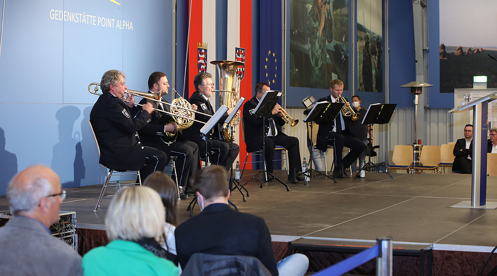 „Es wird immer schwieriger nachzuempfinden, wie es den Menschen damals ergangen ist. Aber glücklicherweise können wir nach 30 Jahren noch mit vielen, die die Zeit selbst erlebt und diese Erfahrungen gemacht haben, ins Gespräch kommen“, stellte Sebastian Leitsch, Geschäftsführer der Point Alpha Stiftung, fest. Die Zeitzeugen in der Gedenkstätte Point Alpha, die bereit seien, den Besucherinnen und Besuchern aus ihrem eigenen Erleben zu berichten, wie sie das westdeutsche Zonenrandgebiet oder das Sperrgebiet der Deutschen Demokratischen Republik erlebt hätten, leisteten mit ihren Erzählungen einen wertvollen Dienst und ließen den Besuch der Gedenkstätte zu einem prägenden Ereignis werden. Zur Sicherung dieser wichtigen Zeugnisse der deutschen und insbesondere auch der lokalen Geschichte für nachfolgende Generationen habe die Stiftung im Jubiläumsjahr in Kooperation mit der Hessischen Landeszentrale für politische Bildung ein langfristig angelegtes Projekt zur Videodokumentation von Zeitzeugeninterviews gestartet. Leitsch zeigte sich davon überzeugt, dass die Frage, wie lange wir noch an die Teilung erinnern „müssen“ und Gedenkstätten wie Point Alpha notwendig seien, ganz einfach beantwortet werden könne: „Hier kann nur immer die richtige Antwort sein!“ Denn die Pflicht als Demokraten sei es, dafür zu sorgen, dass es nicht wieder zu einer solchen Situation in Deutschland und in Europa komme. Frieden, Freiheit und Demokratie dürften nicht zu Worthülsen werden, sondern Ziel müsse es sein, sie durch den Besuch der Gedenkstätte Point Alpha mit Inhalt zu füllen. Abschließend des Festaktes erklangen im ehemaligen US-Camp der Gedenkstätte Point Alpha durch das Blechbläserquintett des Polizeimusikkorps Thüringen die Nationalhymne der USA und die Deutsche Nationalhymne. Ein bewegender Moment anlässlich 30 Jahre deutsche Wiedervereinigung. +++ pm/ja