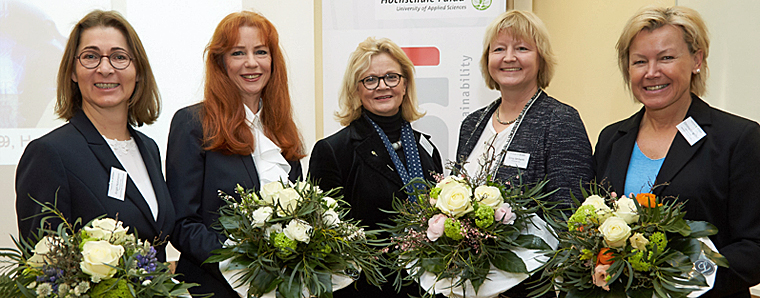 Nahmen zum Jubiläum stellvertretend für alle bisherigen Frauenbeauftragten der Hochschule Fulda Blumen von der Vizepräsidentin Prof. Dr. Kathrin Becker-Schwarze (3.v.l.) in Empfang: Birgit Hohmann, Prof. Dr. Dagmar Preißing, die das Amt derzeit innehaben, sowie Sonja Redweik und Christina Langsdorf. Foto: Nicole Dietzel