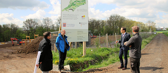 Architekt Stephan Koch, Stadtbaurat Daniel Schreiner und Landschaftsplaner Alexander Sust (von links) erläutern dem direkt gewählten Fuldaer Bundestagsabgeordneten Michael Brand (2.v.l.) die Erweiterungspläne des Heimattiergartens. Foto: Alexander Heinz