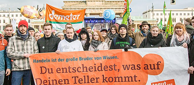 Berlin/ Fulda. Im Zuge der Grünen Woche demonstrierten bei der „Wir haben es satt!“-Demonstration am 20. Januar 33.000 Menschen für den tier- und umweltgerechten Umbau der Landwirtschaft. Unter Ihnen 19 tegut Auszubildende und der Geschäftsführer Thomas Gutberlet auf Erfahrungsreise. Die Botschaft: „Du entscheidest, was auf deinen Teller kommt!“ Das Highlight am ersten Tag war wieder die Schnippeldisko. Dort wurden 1,5 Tonnen Gemüse zur Verpflegung der Demonstranten für eine Suppe verarbeitet. Am zweiten Tag stand dann das Treffen und der Austausch mit dem Demeter e. V. Vorstand Klemens Fischer an.