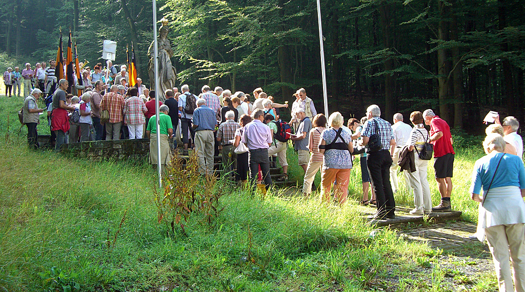 Frieden auf Ewigkeit, Hoffnung und Ehrlichkeit. Frieden auf Ewigkeit für Mensch und Tier - Leben in Herrlichkeit darum bitten wir -, mit diesen Bitten begaben sich die Wallfahrer um 4:45 Uhr im Morgenrauen bei der 35. Bezirkswallfahrt der Kolpingfamilien des Kol-ping Bezirksverbandes Neuhof von Niederkalbach zum Maria Ehrenberg bei Motten in der Rhön. Nach rund 5 1/2 Stunden Fußmarsch trafen die Wallfahrer am Fuße des Maria Ehrenberges ein. Um 9:30 Uhr zogen die rund 200 Wallfahrer betend und singend über die 254 Treppenstufen - begleitet von den Wallfahrtsmusikanten aus dem Bezirk Neuhof - zur Wallfahrtskirche hinauf wo sie von weiteren hinzugekommenen Wallfahrern zum Wallfahrtamt schon erwartet wurden.