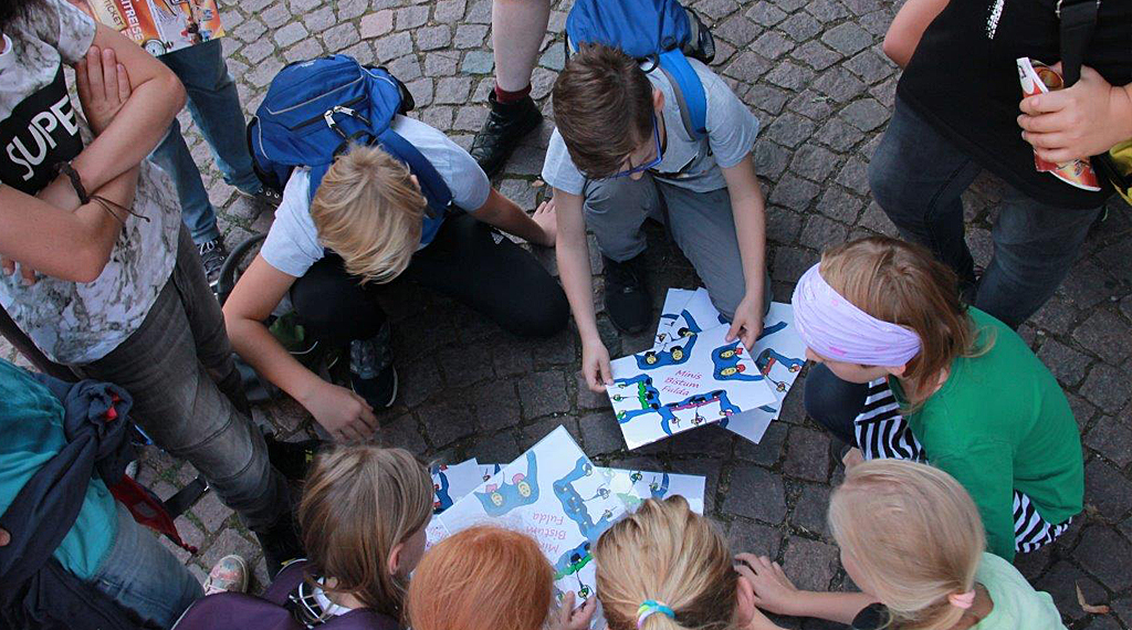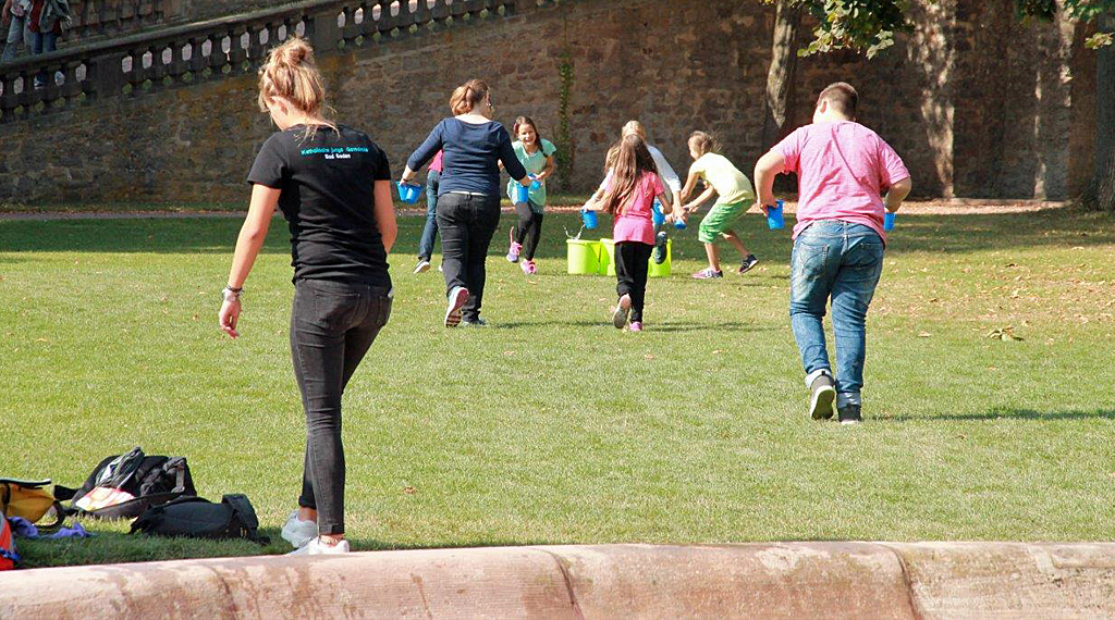 „Ich fand die Station zu den Warttürmen am besten, da mussten wir so viel Wasser, wie möglich, in einen Eimer befördern, um einen Brand zu löschen“, erklärt die dreizehnjährige Sarah aus dem osthessischen Flieden und ergänzt: „Ich bin hierhergekommen, weil ich spannend fand, mal zu sehen, was man in Fulda alles erleben kann und wie es früher hier mal war. Ich habe nicht gedacht, dass man so viel erleben kann und dass es so viele Stationen gibt. "Am Besten hat mir das 1., 2., oder 3. Spiel 'zur Stadt Fulda' gefallen“, erzählt die zehnjährige Lisa aus Bronzell bei Fulda. Den Tag über ging es nicht ausschließlich nur darum, den Spuren zu folgen, sondern auch um Spuren, die man selbst hinterlässt. So stand der Abschlussgottesdienst unter dem Motto: „Du hinterlässt deine Spuren in deiner Zeit und machst die Kirche bunt".