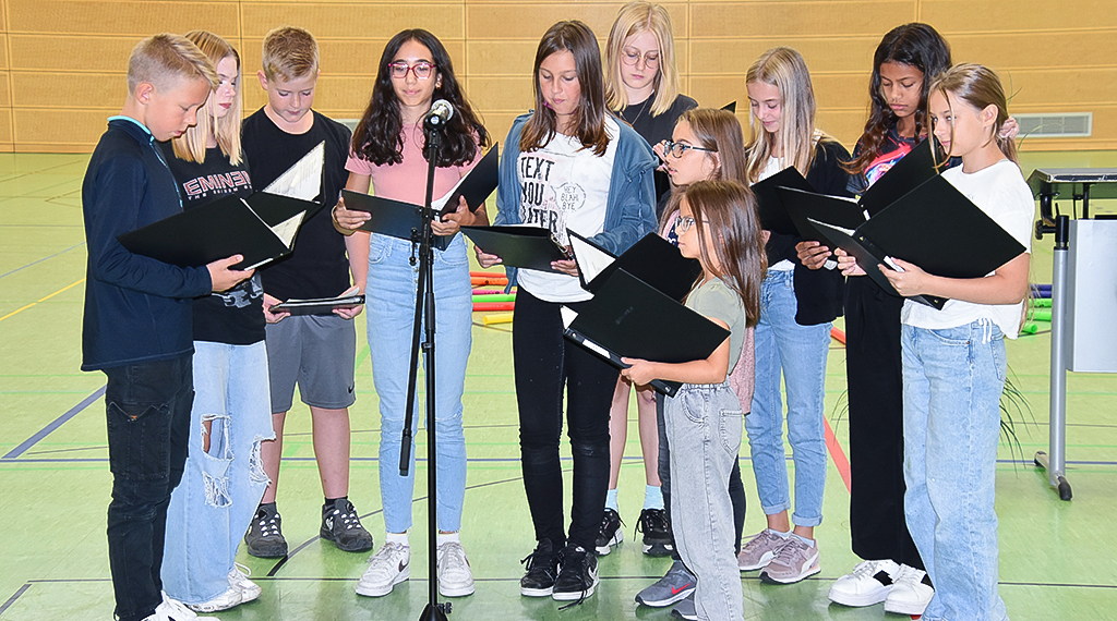 Die musikalische Begleitung lag in bewährten Händen von Musiklehrerin Lisa Schneider (Geige) und Musiklehrer Christoph Müller (Klavier). Am Ende der von Mario Happ vorbereiteten und von Marc Schönhals moderierten Veranstaltung versammelten die neuen Klassenlehrer und Klassenlehrerinnen Margit Krah, Birgitta Wingenfeld, Michael Melia-Klüber, Stefan Metzler und Sabine Vollmer ihre neuen Schülerinnen und Schüler, um sich und alle gingen – zum Teil mit klopfenden Herzen – in die neuen Klassenräume. Den Beginn der Einschulungsaktivitäten bildete ein ökumenischer Gottesdienst für die neuen Schülerinnen und Schüler und deren Eltern. +++ pm