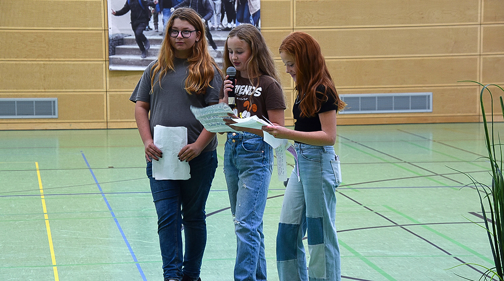 Mit einem bunten Rahmenprogramm wurden anschließend allerlei unterhaltsame Einblicke in das Schulleben geboten. Musik, Tanz und Spiel sorgte immer wieder für lebhaften Applaus. Die Klassen unter Anleitung und Regie ihrer Klassenlehrerinnen Lisa Schneider, Sarah Schleicher, Sandra Schwab und Lea Zaloudek brachten in spielerischer Form allerlei Informationen rund um das Schulleben an der KAS dar.