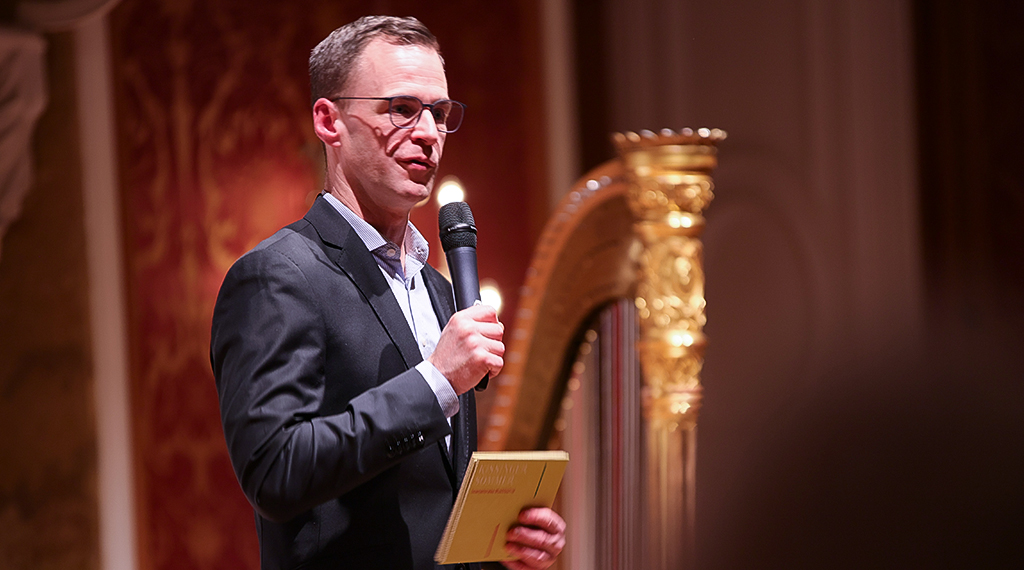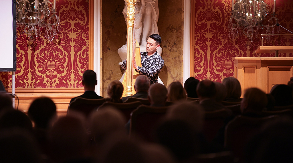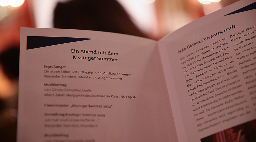 Intendant Alexander Steinbeis und Christoph Stibor, Leiter des Fuldaer Theater- und Kulturmanagements nutzten vor etwa 240 Gästen den gestrigen Abend für einen kurzen Werbeblock beide Städte zu besuchen, vor allem aber auch die dortigen kulturhistorischen Sehenswürdigkeiten zu bestaunen sowie vom jeweils breitgefächerten Kulturangebot zu profitieren. Zwar habe nach Christoph Stibor die hessische Barockstadt noch kein Veranstaltungsformat, das mit dem hochkarätigen „Kissinger Sommer“ zu vergleichen wäre, dennoch mit dem „Fuldaer Musical Sommer“, Konzerten und Theaterstücken (Schlosstheater Fulda) ein beachtliches und vielseitiges Kulturangebot. Nicht unerwähnt ließ Stibor die städtische Musikschule Fulda mit ihrem vielseitigen Angebot für Kinder, Jugendliche und Erwachsene vom qualifizierten Einzel- und Gruppenunterricht bis zur Begabtenförderung. Und musikalisch wurde es auch bei der Programmvorstellung des 38. Kissinger Sommers. Harfenist Iván Gómez Cervantes verwöhnte das Fuldaer Publikum mit Albert Zabels: „Marguérite douloureuse au Rouet Nr. 2 op. 26“, außerdem mit Pjotr Tschaikowskis: „Fantasie aus der Oper Eugen Onegin“ sowie abschließend mit der „Valse Nr. 1 op. 83“ von Auguste Durand. Bad Kissingens Bürgermeister Thomas Leiner (CSU) unterstrich im Gespräch mit Intendant Alexander Steinbeis die Bedeutung des Kissinger Sommers für die Kurstadt, die sich seit 2021 offiziell UNESCO Welterbe nennen darf. Wenn in den Sommermonaten Palmen das Kurzentrum botanisch bereichern und während des Kissinger Sommers Gäste aus Nah und Fern in der Stadt unterwegs sind, versprühe Bad Kissingen noch einmal ein ganz besonderer Flair. Neben den Konzerten habe die Kurstadt an der Saale immens viel zu bieten.