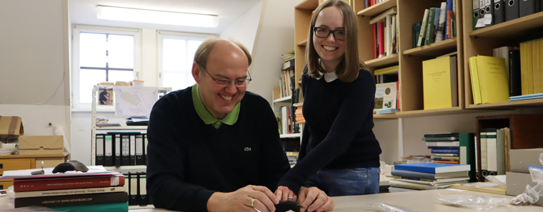 Ein Schreibtisch voller Milseburg-Scherben – reine Freude für den Stadt- und Kreisarchäologen Dr. Frank Verse und die Archäologin Steffi Rößner. Sie bringt seit einem Jahr System in die Funde und wird daraus Rückschlüsse ziehen. Foto: Leoni Rehnert