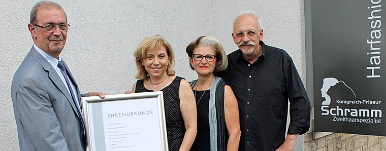 Flieden. Gerlinde Ubig (58) konnte jetzt ihr 40-jähriges Arbeitsjubiläum beim Königreich-Friseur Schramm in Flieden im Landkreis Fulda feiern. Ihre Ausbildung zur Friseurin, absolvierte sie von 1972 bis 1975 im Salon Schleicher in der Bahnhofsstraße in Fulda. Am 01. Juni 1976 trat sie dann ihre neue Stelle in Flieden an. Schon als Kind, bereitete ihr das Frisieren von Puppen große Freude. Deshalb stand für sie bereits mit sechs Jahren fest, dass sie später einmal den Beruf der Friseurin ausüben werde. Für Marion und Bernhard Schramm, ist Gerlinde Ubig – eine Botschafterin ihres Berufes. „Frau Ubig übt ihren Beruf mit großer Leidenschaft mit hoher Wertschätzung gegenüber ihren Kunden aus“, so Bernhard Schramm, der hinzufügt: „Darauf können wir und auch Gerlinde Ubig, mächtig stolz sein, denn ein 40-jähriges Arbeitsjubiläum, gibt es so häufig nicht.“ Der Salon Schramm in der Schlüchterner Straße in Flieden, existiert seit 66 Jahren und wird heute in der zweiten Generation geführt. Die dritte Generation, steht bereits in den Startlöchern. Im Laufe der Jahre, konnten zahlreiche Auszubildende erfolgreiche beim Friseursalon Schramm ihre Gesellenprüfung ablegen. Zum 40-jährigen Arbeitsjubiläum gratulierte Dietmar Weidenbörner, Geschäftsführer der Kreishandwerkerschaft Fulda und der Friseur-Innung Fulda, und überreichte Frau Ubig in Flieden eine Ehrenurkunde. +++ fuldainfo | pm