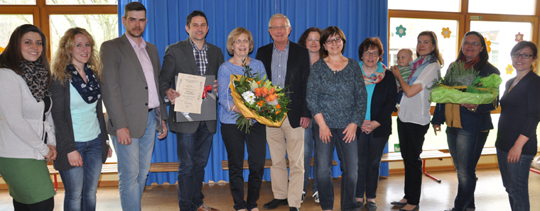 Bürgermeister Dieter Kolb würdigte im Beisein des Erzieherinnen-Teams und des Elternbeirates die langjährige, pädagogische und zuverlässige Arbeit von Ingrid Auth. Besonders erwähnte er ihr hohes Maß an Kompetenz, Zuverlässigkeit und Verantwortungsbewusstsein sowie das große persönliche Engagement über 40 Jahre in der Kindertagesstätte. Nicht unerwähnt lassen wollte der Verwaltungschef das gute Miteinander unter den Mitarbeiterinnen und dem Elternbeirat. Auch hier dankte er Frau Auth für ihre stets professionelle und teamorientierte Zusammenarbeit.