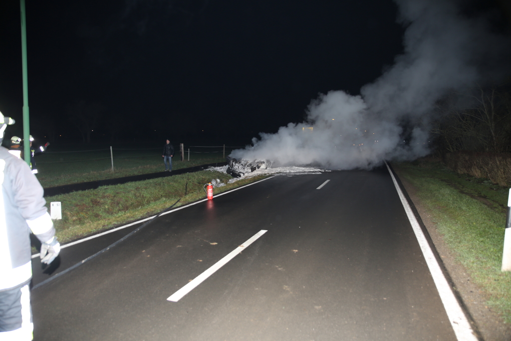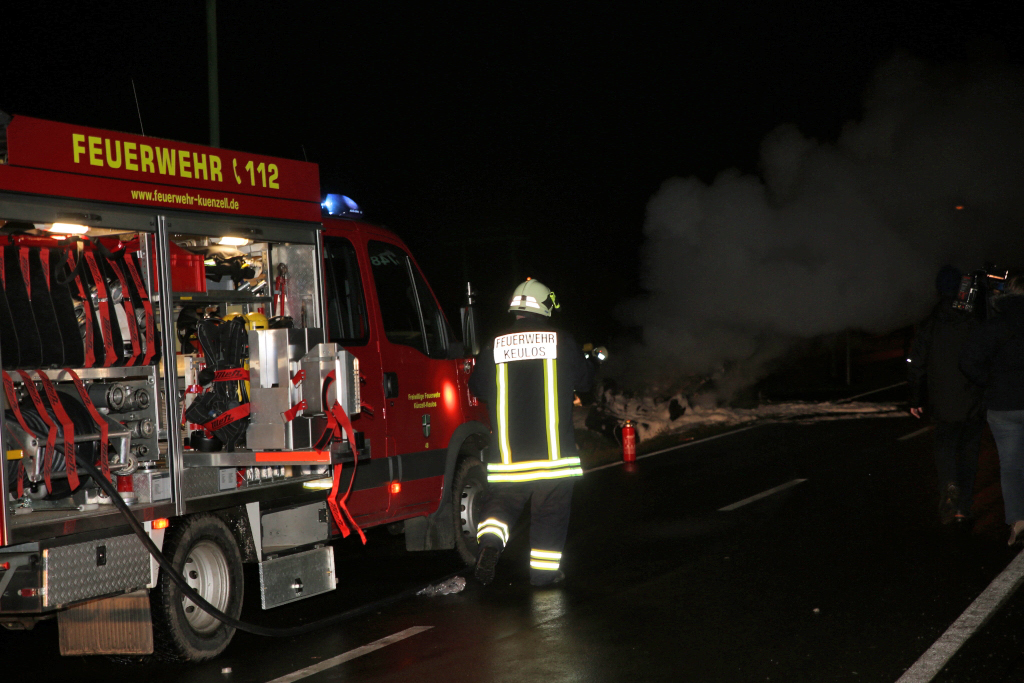 „Das war sehr erschreckend, wie viele Leute vorbeigefahren sind. Manche hatten gebremst, gaben dann aber wieder Gas. Teilweise waren Leute auf der Straße, aber auch dann sind Fahrzeuge vorbeigefahren“, kritisiert Herber, der feststellen muss: „Es wird einem zwar geholfen, aber das dauert seine Zeit.“ Besser lief dafür der zweite Teil der Übung. Nachdem das Fahrzeug in Brand gesteckt worden war: Sechs Minuten nach der Alarmierung – war die Einsatzabteilung der Keuloser Feuerwehr mit etwa 20 Feuerwehrkräften vor Ort. „Das ist eine starke Zahl für einen so kleinen Ort wie Keulos“, freut sich Herber, der auch mit dem Übungsablauf rundum zufrieden war: Für unser neues Löschgerät war das quasi die Feuertaufe, es hat alles super gut geklappt. Innerhalb von fünf bis sechs Minuten war das Fahrzeug abgelöscht.“ +++ fuldainfo