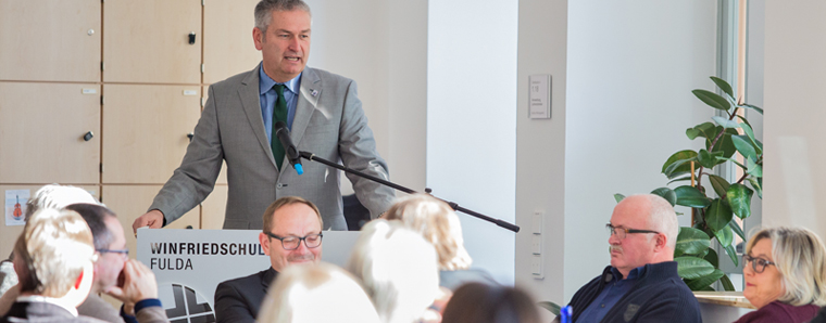 Nach Aussage von Landrat Bernd Woide entwickele sich Schule durch den gesellschaftlichen Wandel kontinuierlich weiter. Notwendig seien nicht nur Unterrichtsräume, sondern auch Räume, in denen Bildung geplant, strukturiert und besprochen werde. Neben all den aktuellen Herausforderungen gerade in der Flüchtlingshilfe müsse sich der Landkreis der zentralen Aufgabe widmen, Schule zukunftsfähig zu machen. Deshalb werde man auch nicht die räumliche Erweiterung der Winfriedschule in Richtung Lioba-Areal aus dem Blick verlieren.