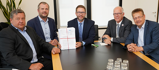 Eine weitere Stärkung des Wirtschaftsstandortes Main-Kinzig: Die Firma Spitzke SE siedelt sich auf dem ehemaligen Fliegerhorst Erlensee/Bruchköbel an. Bürgermeister Stefan Erb (Erlensee), Bürgermeister Günter Maibach (Bruchköbel), Landrat Thorsten Stolz (Main-Kinzig-Kreis), Torsten Völker und Horst Rauch bei der Übergabe der Baugenehmigung.