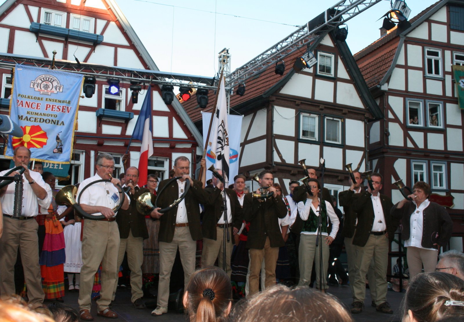 Und dann ist es so weit, der Stadtwache gelingt es, einen Zugang zur Bühne frei zu halten, sodass die Gruppen ungehindert diese erreichen können und der Vorsitzende des Heimat- und Trchtenvereines, Bürgermeister Hans-Jürgen Schäfer mit der Festrede beginnen kann, die er in seiner gewohnten und engagierten Art und Weise und oft von starkem Beifall unterbrochen, zu Gehör bringt. Nach musikalichen Beiträgen der Jagdhornbläser und dem Schlitzer Lied, vorgetragen von dem Chor des Trachten- und Volkstanzkreises unter Leitung von Ute Fischer, kann Anke Schmier das Wort ergreifen und auf die wichtigsten Vorbereitungsschritte hinweisen und den Gasteltern danken, die einen erheblichen Beitrag leisten, um das Trachtenfest überhaupt feiern zu können. Nach einem weiteren Jagdhornbläserbeitrag und dem Vortrag einiger Mundartreime durch Reinhold Horn konnte Hans-Jürgen Schäfer mit erhobenen Händen das 42. Schlitzerländer Trachten- und Heimatfest eröffnen und Dieter Richter die schöne Aufgabe des Moderierens weiter ausführen und die folgenden Tänze der verschiedenen nationalen und internationalen Trachtengruppen ankündigen.