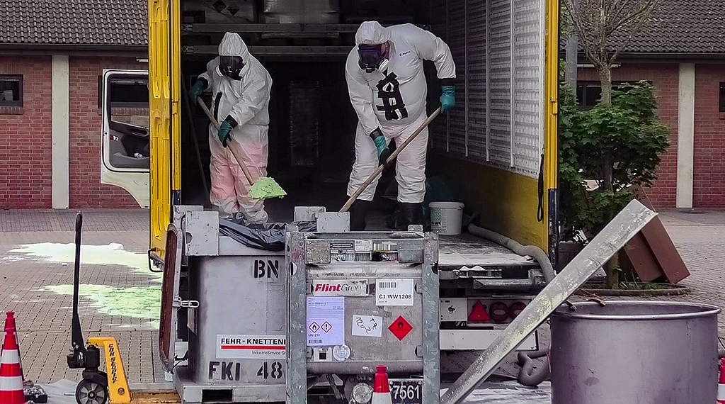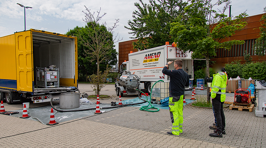„Wir verdünnen den hoch konzentrierten Stoff mit Wasser, geben ihn in spezielle IBC Container (Intermediate Bulk Container, Anm. d. Red.), der Gutachter nimmt Proben, dann wird das Ganze im Nachgang analysiert und festgelegt, in welche spezielle Anlage das Ganze gefahren werden kann, um es dort fachgerecht zu entsorgen. Vermutlich wird es irgendwo nachher in die Verbrennung gehen. Aber das entscheiden letzten Endes die Gutachter mit ihrer Analytik“, sagt Frank Weber.