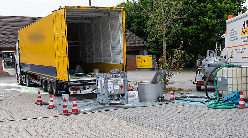Eine genaue Angabe, wie viel ausgelaufen war, konnte die Feuerwehr zu diesem Zeitpunkt nicht sagen. „Die Menge ist schwer zu sagen. Das Behältnis selbst hat angegeben 388 Kilo Ladung. Wie viel davon ausgelaufen ist, wissen wir nicht genau, aber der größte Teil schon“, erklärt Stadtbrandinspektor Daniel Schäfer. Klar war zu diesem Zeitpunkt schon, dass der Aufwand der Entsorgung schwerer und umfangreicher wird. „Dadurch, dass das eine Farbe ist, die sich jetzt auch so langsam in gewissen Teilen verfestigt. Und hier auf dem Pflaster von dem Parkplatz wird das, glaube ich, eher aufwendig werden, das zu reinigen. Das muss jetzt alles aus diesem Datenblatt, auf das wir aktuell immer noch warten, herausgefunden werden“, so Schäfer.