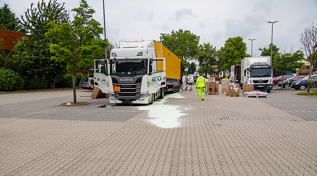 In der Nacht zu Dienstag wurde gegen 2.00 Uhr der Polizeistation in Alsfeld von einem Zeugen gemeldet, dass aus einem geparkten Sattelzug im Bereich der Grünberger Straße eine Flüssigkeit austrat. Bei der Nachschau durch eine Streife der Alsfelder Polizei auf dem Parkplatz eines Discounters stellten die Beamten fest, dass aus dem Auflieger eines Sattelzuges aus dem Landkreis Calw in Baden-Württemberg eine helle und stark riechende Flüssigkeit tropfte. Der 24-jährige Fahrer, nicht wie erst versehentlich von der Polizei berichtet der 21-jährige Fahrer aus Baden-Württemberg, klagte über Kopfschmerzen, sodass er vor Ort vom Rettungsdienst ambulant behandelt wurde.