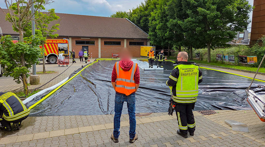 Frank Weber vom Bergeunternehmen aus Grünberg erklärt unserer Zeitung gegenüber: „Der Gefahrstoff ist im Lkw-Sattelauflieger Bereich ausgelaufen. Die Feuerwehr Alsfeld hat im Erstangriff und in den Erstmaßnahmen die Gefahrenabwehr betrieben, die Sicherheitsdatenblätter organisiert und im Prinzip das weitere Austreten verhindert.“ In der nächsten Instanz wurde das Bergeunternehmen als Havariemanagement beauftragt, mit mehreren Einsatzfahrzeugen den Schaden zu beseitigen und zu beheben. Wichtig war erst mal die Kanaleinläufe zu sichern, denn sollte es bei einem Regenfall oder einem Regenschauer zu einem weiteren Austritt kommen, der nicht schnell lokalisierbar ist, „damit wir das Gewässer und den Boden schützen können“, so Weber. Im weiteren Verlauf wurde der Inhalt der Behälter in Spezialbehälter umgepumpt und damit die Undichtigkeit gestoppt.