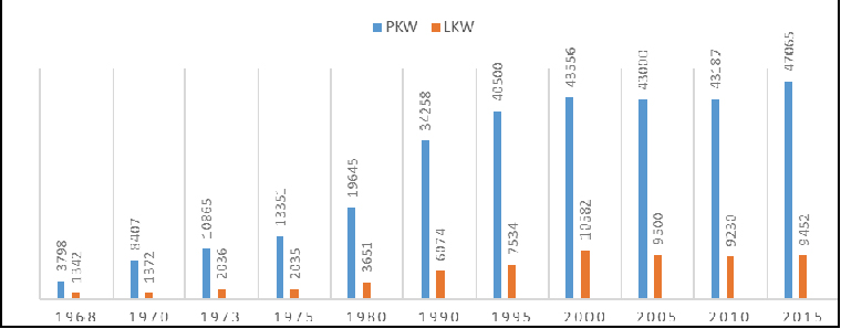 Durchschnittliche Tägliche Verkehrsmenge je 24 Stunden (DTV) A 7 bei Fulda, 1968 – 2015