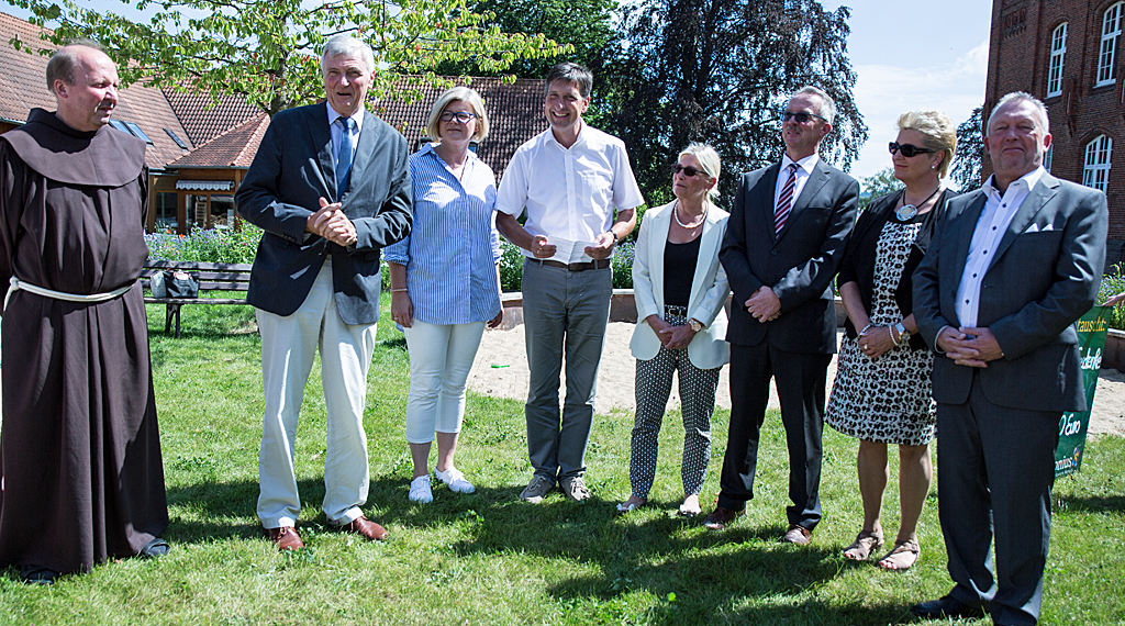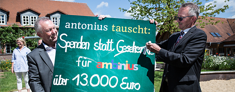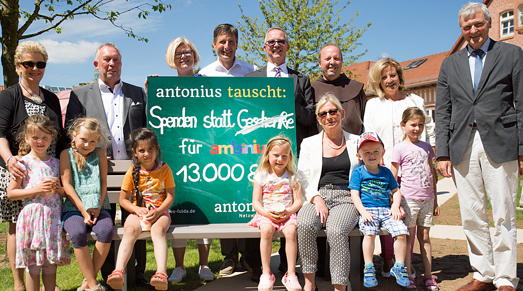 Fulda. Heute erfolgte „Auf der Bleiche“, dem Mittelpunkt des Geländes von „antonius. Netzwerk Mensch“, die offizielle Spendenübergabe der beiden Fuldaer Unternehmer Peter Henkelmann, Geschäftsführer des hiesigen Media Marktes, und Franz Heimann, Geschäftsführer der Fuldaer Sparkassen-Immobilien „Heimann & Fladung“, an „ambinius – Die Kita Plus – für jung und alt“. Henkelmann und Heimann feierten in diesem Jahr beide ihren 60. Geburtstag. Anstatt Geschenke, wünschten sich beide Unternehmer – von ihren Geschäftspartnern, Freunden und Bekannten sowie Kolleginnen und Kollegen, lieber Spendengelder für antonius-Projekt – „ambinius“.