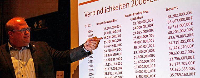 Stephan Paule erläutert den Entwurf des Haushalts 2019 und zeigt auf, wie sich die städtischen Schulden in den letzten 12 Jahren entwickelt haben.