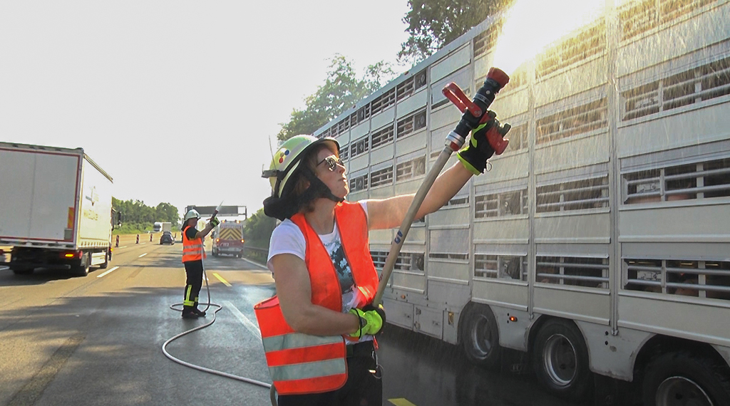 Zu einem besonderen Einsatz mussten am Mittwochnachmittag gegen 16.45 Uhr die Feuerwehren aus Niederaula und Kirchheim ausrücken. Auf dem Autobahnabschnitt zwischen dem Kirchheimer Dreieck und dem Hattenbacher Dreieck war ein mit 700 Ferkeln beladener Sattelzug mit einer Reifenpanne liegen geblieben. Eine Streife der Autobahnpolizei, die den Sattelzug absicherte alarmierte sofort die Feuerwehren aus Niederaula und Kirchheim, da die jungen Tiere bereits äußerlich unter der sengenden Hitze von 35 Grad an der Einsatzstelle litten. Die Feuerwehr aus Niederaula, die zuerst die Einsatzstelle erreichte, begann sofort aus mehreren Rohren, den gesamten Tiertransporter zu kühlen. Für eine ausreichende Wasserversorgung war bereits auch die Feuerwehr aus Kirchheim alarmiert um immer genügend Wasser vorhalten zu können. „Wenn es nicht reicht, werden wir auch noch Bad Hersfeld hinzuziehen, dann können wir bis in die Nacht hinein die Tiere erfrischen“ sagte Einsatzleiter Udo Mohr an der Einsatzstelle. Auch ein Veterinär wurde zur Einsatzstelle bestellt. Für den Einsatz mussten in Fahrtrichtung Süden zwei von drei Fahrspuren gesperrt werden. Es bildete sich ein Stau von mehreren Kilometern, wovon auch die A4 in Richtung Kirchheim erheblich betroffen war. +++ yk